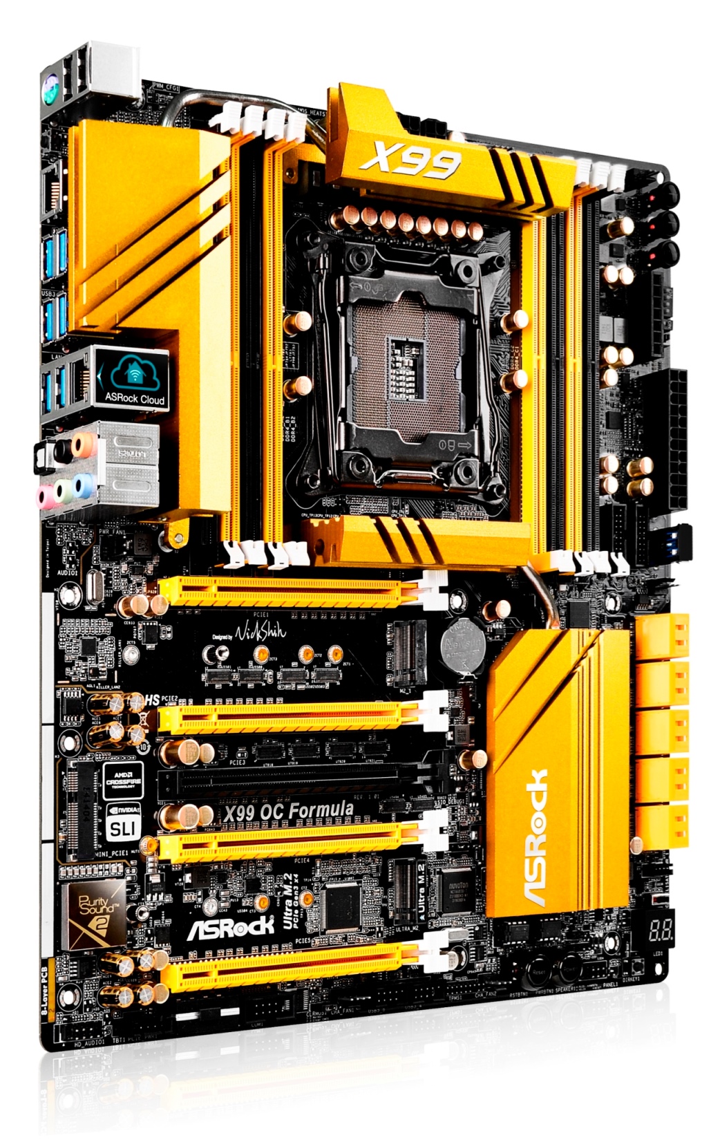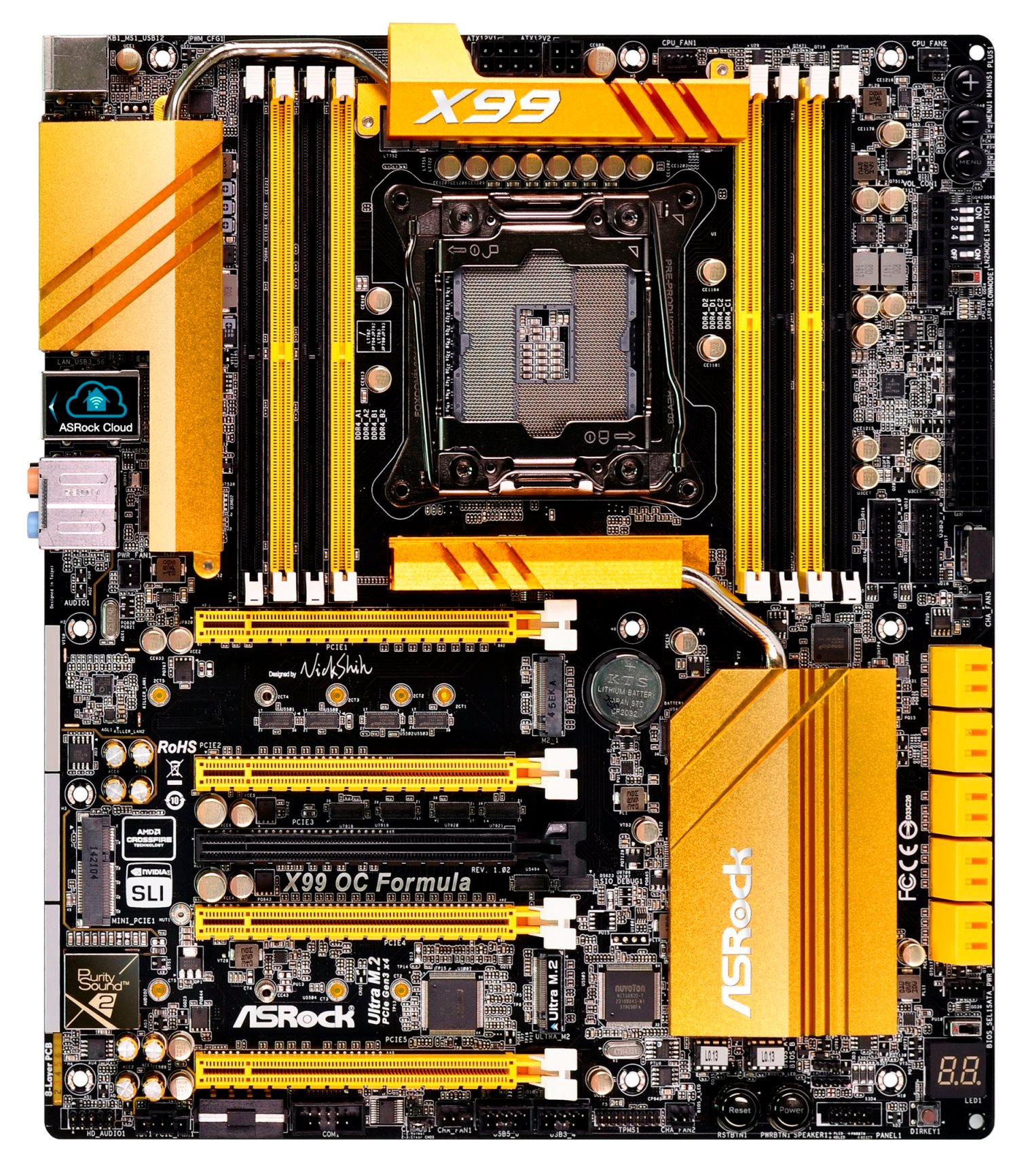 La ASRock X99 OC Formula, grazie alle 12 fasi di alimentazione, supporta fino a un carico di 1300W, con energia proveniente anche dai connettori ATX12V da 8+4-pin, come apprezzati anche sulla MSI X99S XPOWER AC e X99S MPOWER. Con il classico stile giallo-nero, sul PCB si nota la firma dell'overclocker Nick Shih che ha contribuito alla realizzazione della mainboards da 8-layer PCB. La scheda presenta la copertura idrofobica "Conformal Coating" che ne permette di preservarne i danni da problemi di condensa. Con supporto alle tecnologie SLI e CrossFireX, sono presenti cinque slot PCI-E 3.0 x16 (probabilmente quello nero ha contatti elettrici PCIe x4), due slot M.2, un mini PCIe, dieci porte SATA 6 Gbps e non vi è traccia di una porta SATA Express. Sono presenti i controlli onboard, punti di lettura della tensione e un debug LED, con switch dual Bios. La soluzione audio comprende la tecnologia Purity Sound 2.