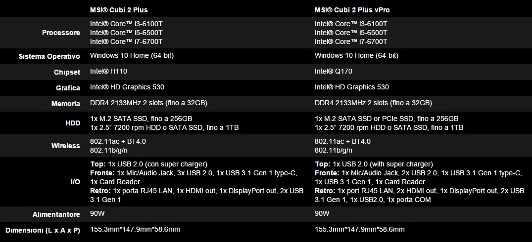 MSI è lieta di annunciare il nuovo mini-PC della propria linea: MSI Cubi 2 Plus. Il Cubi 2 Plus è costruito per essere - a dispetto delle ridottissime dimensioni - il punto d'incontro tra le necessità business e le necessità consumer, concentrando tutto ciò che è necessario nel palmo di una mano. La nuova generazione di Cubi dispone di una nuova scheda madre STX (5x5); la scheda madre STX del Cubi è più piccola del 29% rispetto alle già ridotte schede mini-ITX, rendendo la piccola STX la scheda più compatta con una cpu non saldata. Grazie all'uso di CPU Skylake-S, aggiornabili, non solo il Cubi 2 Plus dispone di maggior potenza e minori consumi rispetto al passato, ma anche della possibilità di vedersi aggiornato in tutte le sue parti.