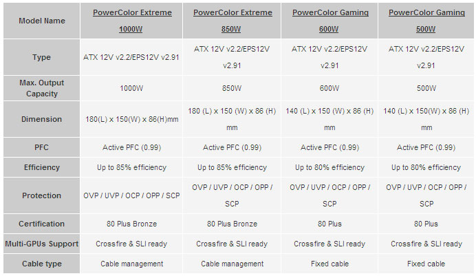 powercolor_logoOggi PowerColor ha ufficialmente presentato la nuova gamma di alimentatori dedicati al popolo dei videogiocatori. La serie Extreme comprende i modelli da 1000W e 850W, la serie Gaming ha modelli da 600W e 500W.