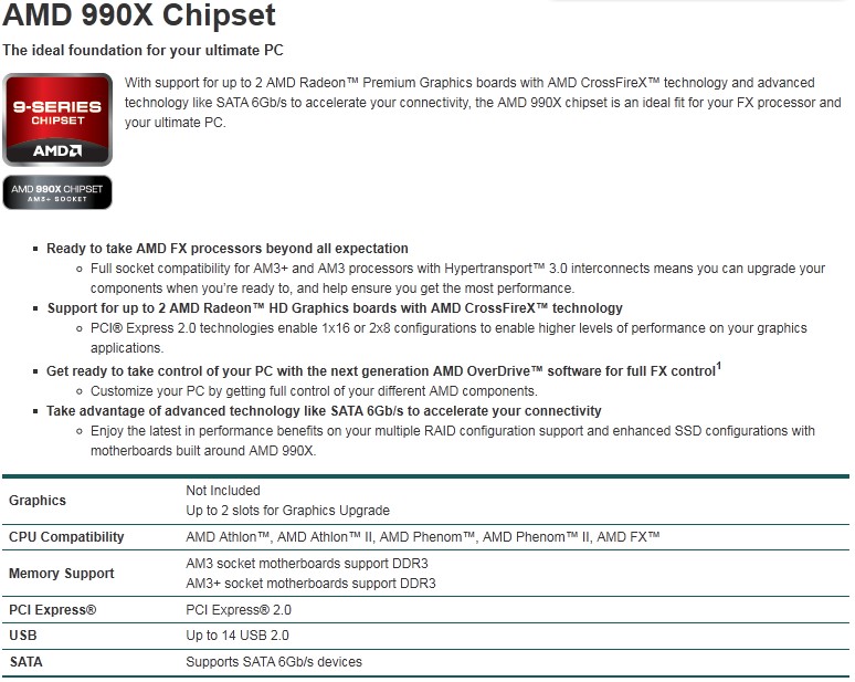 AMD annuncia i chipset della serie 900 con supporto ufficiale alle CPU Bulldozer FX e destinati alle schede madri con socket AM3+.Le principali differenze tra i tre chipset riguarda il numero di link PCI Express per l'installazione di schede video nel sistema. Il 990FX equipaggerà le schede top di gamma AM3+ e permetterà di gestire fino a 4 schede video (SLI o Crossfire) con link Pci Express 2.0 @ x8 o due schede video @ x16. Il 990X potrà gestire 2 schede @ x8 o una @ x16 e il 970 permetterà soltanto configurazioni a singola scheda video @ x16.