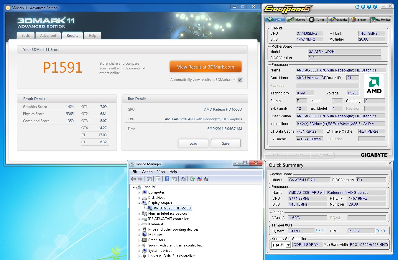 E 'importante notare come i core dellaa CPU sono stati overcloccato a 3,773 GHz (145,13 x 26,0 MHz), con una tensione di 1.52V. Le memorie usate nel test erano delle dual-channel DDR-3 1333 MHz anche se la l' APU supporta le più veloci DDR-3 1866 MHz.