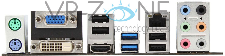 Nel pannello posteriore troviamo due porte PS/2, quattro porte USB 2.0 e due 3.0, una porta Gigabit Ethernet, collegamenti audio da 7.1 canali (gestiti da un chipset Realtek) e tre uscite video: una D-Sub, una DVI ed una HDMI.