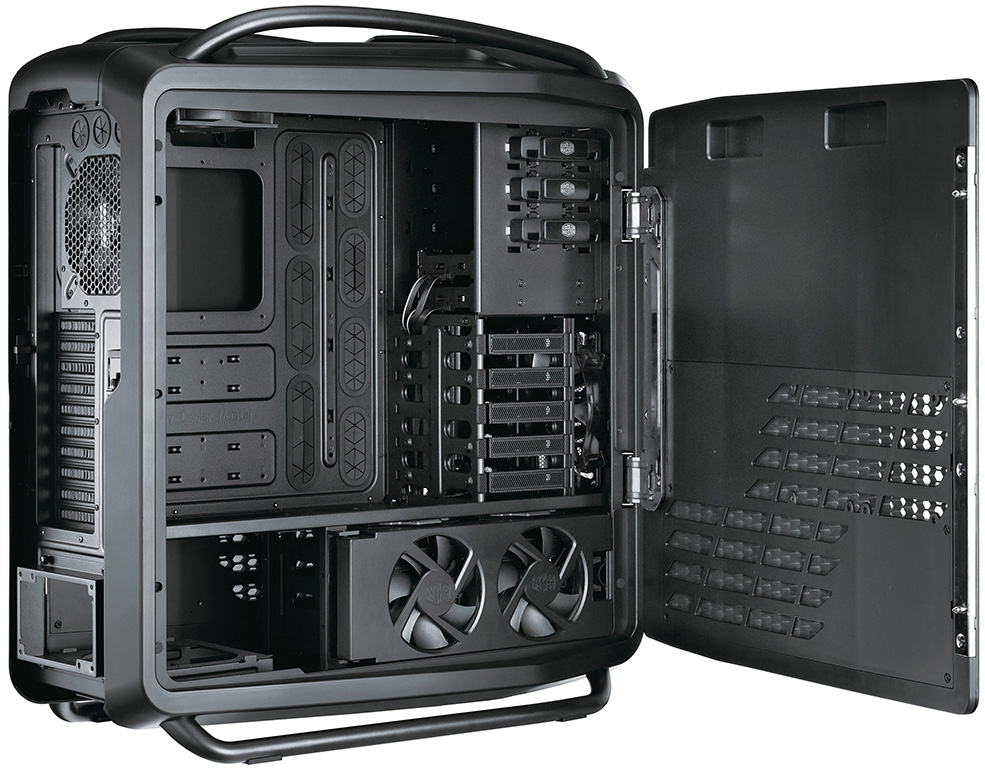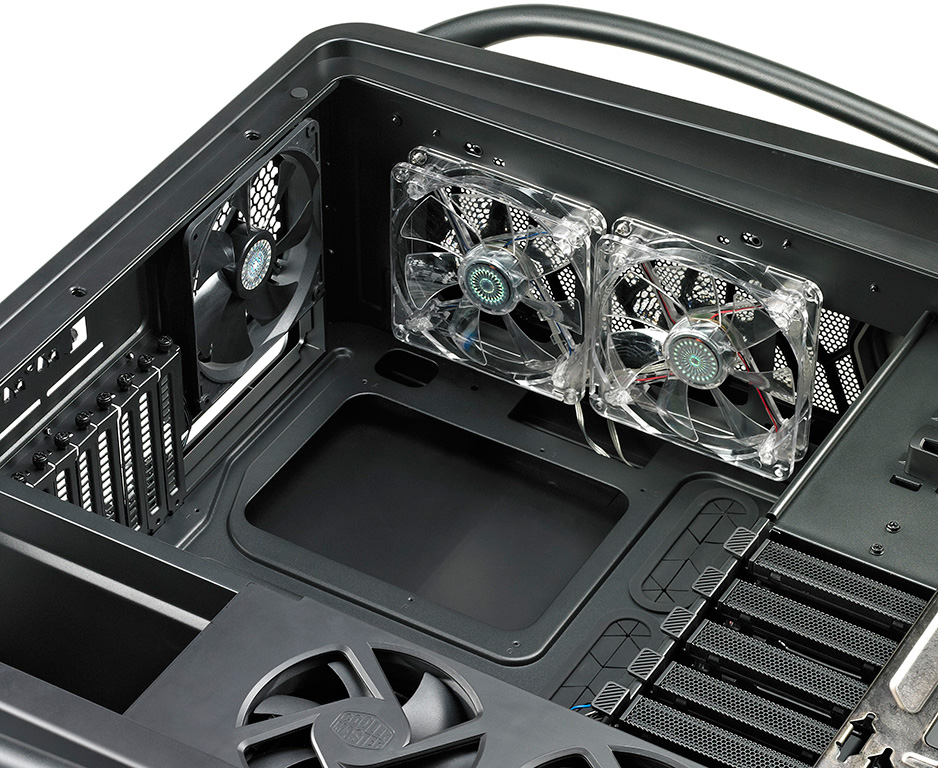 Internamente il Cosmos 2 è semplicemente immenso, con spazio fino a 10 ventole, 13 HDD, configurazioni 4-way SLI e Crossfire con schede video lunghe fino a 385mm. Ben 10+1 (per estensioni aggiuntive) gli slot PCI disponibili.