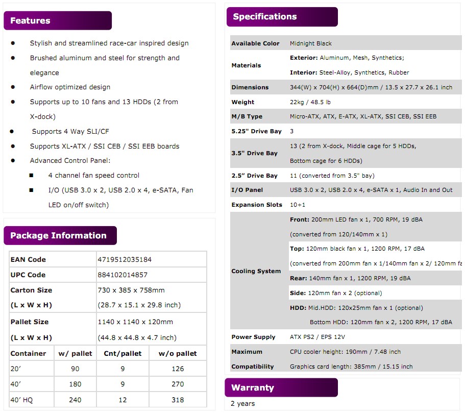 Non viene fatto cenno alla compatibilità con schede madri instandard HPTX come le EVGA SR-2 e SR-3, le dimensioni abbondanti del case fanno però ben sperare in questo senso.