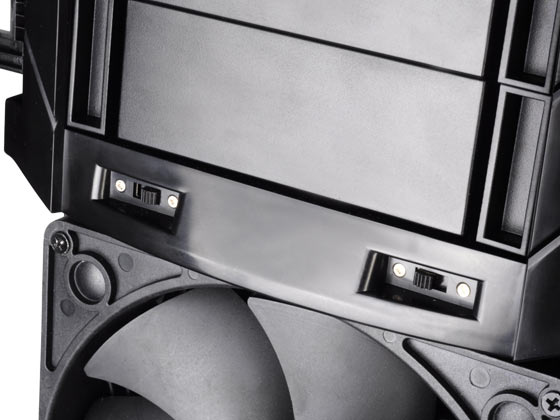Per la ventilazione sono presenti due ventole frontali AP181 da 180mm (600 / 900 / 1200 RPM, 18 / 25 / 34 dBA) e una ventola posteriore da 120mm che trova alloggio sotto gli otto slot PCI. Nella zona anteriore, posizionate sul lato, sono presenti due porte USB 3.0 e i connettori audio in/out.