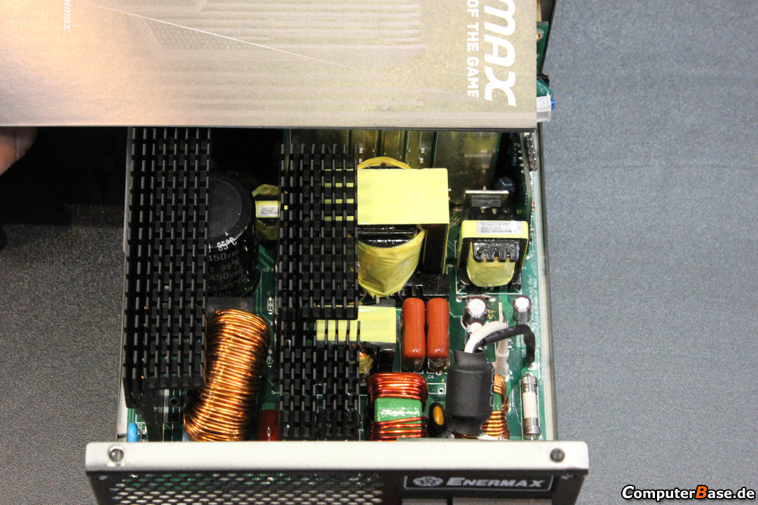 Quei mattacchioni di ComputerBase si sono portati un misuratore di potenza, un cacciavite e un termometro termico alla fiera di Hannover; non si sa mai quello che può succedere in questi eventi ed è meglio andarci preparati! Seppur con tutte le limitazioni del caso, la potenza assorbita sembra piuttosto simile alle misurazioni fatte e la temperatura rilevata dal termometro è risultata prossima a quanto segnalato dal software. Per un modello in pre-produzione hanno aperto la scocca di un altro alimentatore per controllare i segreti di Enermax. Una zona è stata comunque coperta perché non può essere resa al momento pubblica.