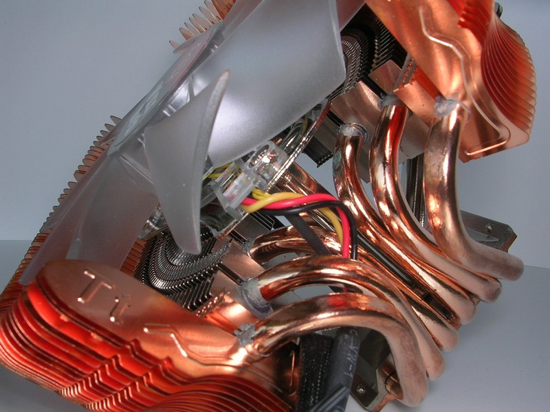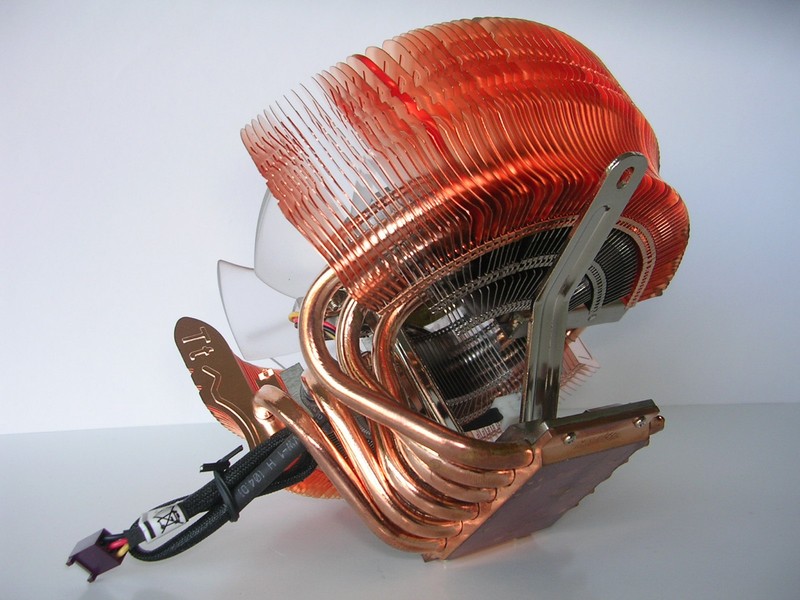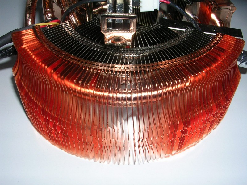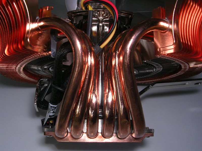 Dalla base si dipartono 6 heatpipes in rame del diametro di 6mm, che rialzano il corpo dissipante di circa 3cm rispetto alla sommità della base. Le heatipes sono poi piegate ad anello e attraversano le alette formando dei cerchi. In realtà sembrano ricongiungersi all'estremità opposta del dissipatore, in corrispondenza della staffa che sorregge il potenziometro, facendo quindi supporre che siano soltanto tre heatpipes che partono dalla base e poi ritornano. Tuttavia questo non costituirebbe una grande differenza in quanto il funzionamento sarebbe comunque simile a quello di 6 heatpipes distinte. Da notare che solo le heatpipes più esterne conducono il calore a delle alette in rame. Per quelle centrali, che trasportano anche più calore, è stato scelto infatti un corpo con alette radiali in alluminio. Benché sia risaputo che il rame conduce meglio il calore, non a tutti è noto che l'alluminio offre proprietà migliori di scambio termico (e per questo motivo è spesso preferito per la costruzione delle alette). L'argomento offre numerosi spunti di discussione ma, a nostro giudizio, la scelta di utilizzare l'alluminio nella parte sottostante alla ventola, non è stata fatta per risparmiare sul costo minore rispetto al rame (oltretutto è una parte anche molto piccola rispetto al resto del dissipatore) ma per migliorare le prestazioni. La stessa soluzione di alette sia in alluminio che in rame era stata già adottata sul DuOrb, dissipatore già recensito tempo fa dalla nostra redazione.
