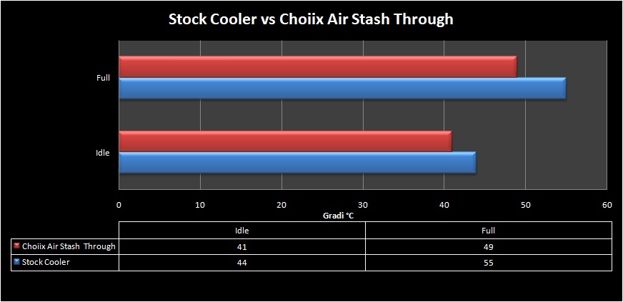 Come si può notare dal grafico sovrastante il portatile non scalda molto e mantiene temperature di esercizio piuttosto contenute. Senza la base ventilante raggiungiamo in idle  44°C e in full-load 55°C. Usando la Choiix Air Through Stash riusciamo ad abbassare la temperatura in idle di 3°C, raggiungendo i 41°C, mentre in full-load riusciamo a guadagnare ben 6°C, portando la temperatura non oltre i 49°C.