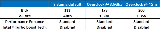 I test sono stati effettuati con le seguenti impostazioni da Bios, ciò che non è presente nella tabella è stato lasciato tutto con le impostazioni predefinite di casa: