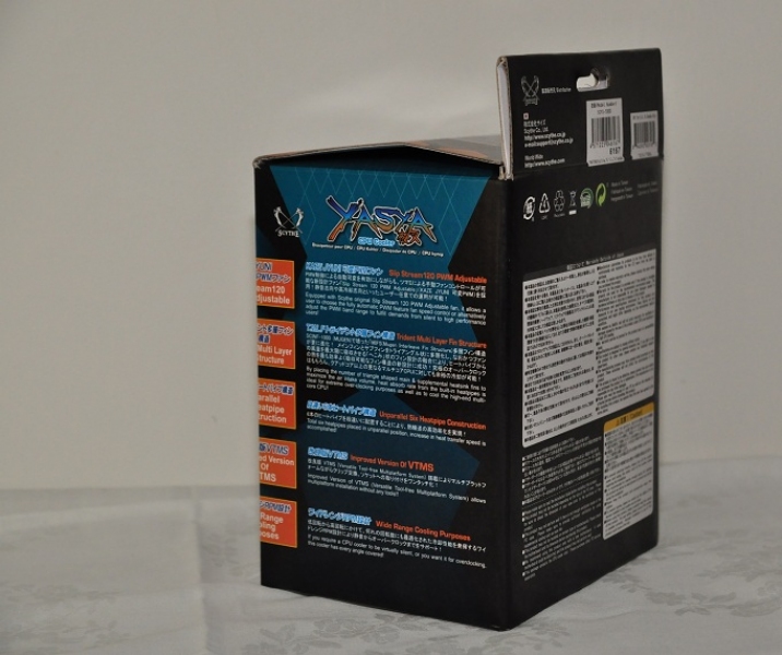 Il dissipatore è riposto all’interno di una scatola pressoché cubica, senza aperture che permettano di vedere dall’esterno il prodotto. Lo stile dei colori e la scritta sul fronte ci ricordano i manga giapponesi per le sue forme e colori. Le scritte sono prevalentemente in giapponese e in parte in inglese. Nel lato sinistro troviamo una piccola tabella multi-lingua con le specifiche tecniche del prodotto.