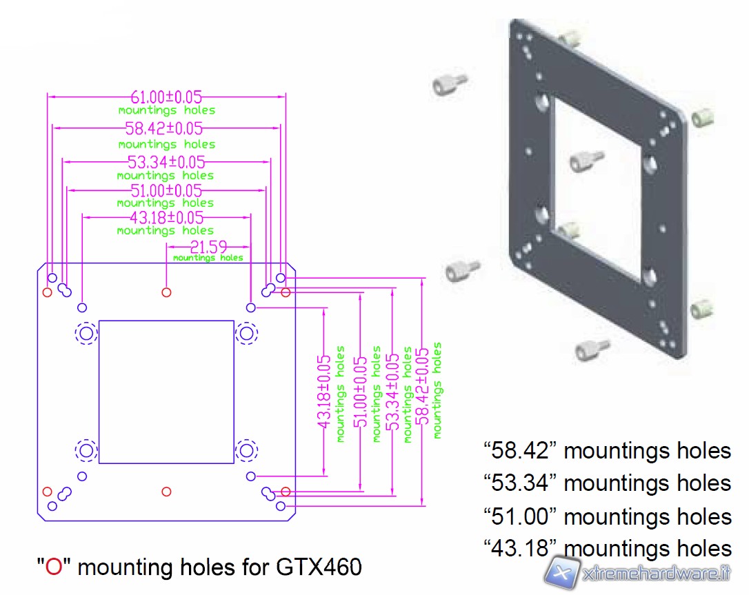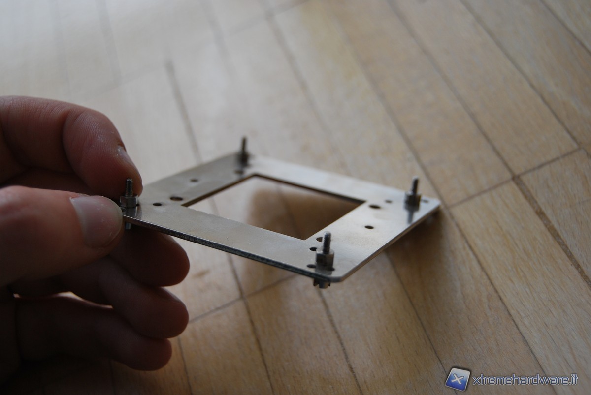 Per prima cosa smontiamo il dissipatore stock, svitando le quattro viti sul retro della scheda video. Successivamente dobbiamo preparare la staffa con i 4 perni che serviranno poi ad agganciare il dissipatore al retro della scheda. I perni vanno avvitati nella posizione mostrata nelle istruzioni, dipendente dall’interasse dei fori sulla VGA. La staffa fornita nella confezione consente l’installazione in tutte le schede video ma occorre fare particolare attenzione ad avvitare i perni nella giusta posizione. Occorre inoltre fare attenzione ad avvitare i perni dal giusto lato. In uno dei due lati della staffa, infatti, sono presenti delle svasature che servono ad accogliere le viti che useremo per avvitare la staffa alla base.