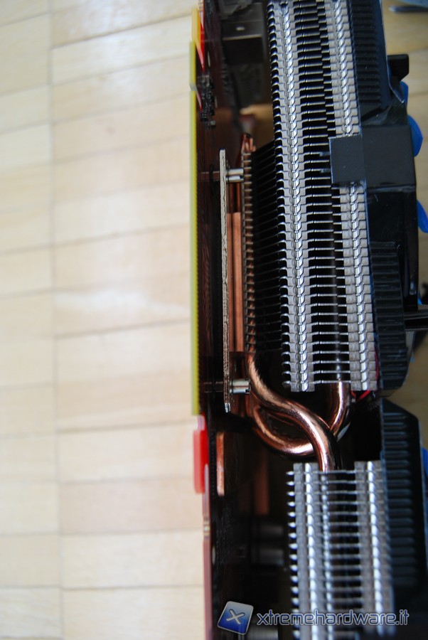 Ora siamo pronti per agganciare il dissipatore alla scheda, avvitando i bulloncini ai perni che fuoriescono dal retro. Lateralmente controlliamo l’ottimo contatto tra base e gpu, operazione necessaria per assicurarci della corretta installazione del dissipatore.
