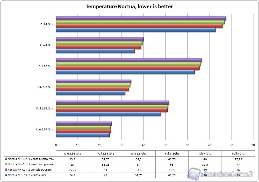 Come si può notare fra il Noctua con 2 ventole a pieno regime e 2 ventole a 900rpm ci sono 3°C di differenza in full-load @ 4Ghz, che diventano 4 se montiamo una sola ventola sopra a pieno regime. Anche usando solo la ventola inferiore, configurazione ideale per sistemi HTPC, col sistema in overclock possiamo avere buone temperature che si attestano ad un massimo di circa 78°C @4GHz, temperatura media del dissipatore stock Intel con un leggero overclock sulla CPU.