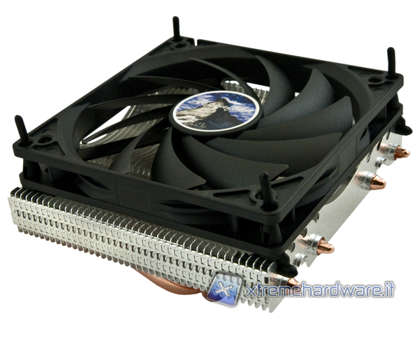 Come si può vedere dall’immagine il dissipatore è molto piccolo. La sua altezza, ventola inclusa, raggiunge i 70mm di altezza ed è l’ideale per tutti i case HTPC o i case d’ufficio in cui montare un sistema di raffreddamento dai costi contenuti e dalle buone performance. Poco sopra la base troviamo un altro piccolo dissipatore a pettine che consente di migliorare ulteriormente l’efficienza del raffreddamento. La struttura delle lamelle del corpo principale è molto particolare ed è intagliata al fine di favorire la penetrazione dell’aria nel dissipatore, evitandone la fuoriuscita ai lati e turbolenze in grado di aumentare il rumore prodotto dalla ventola.