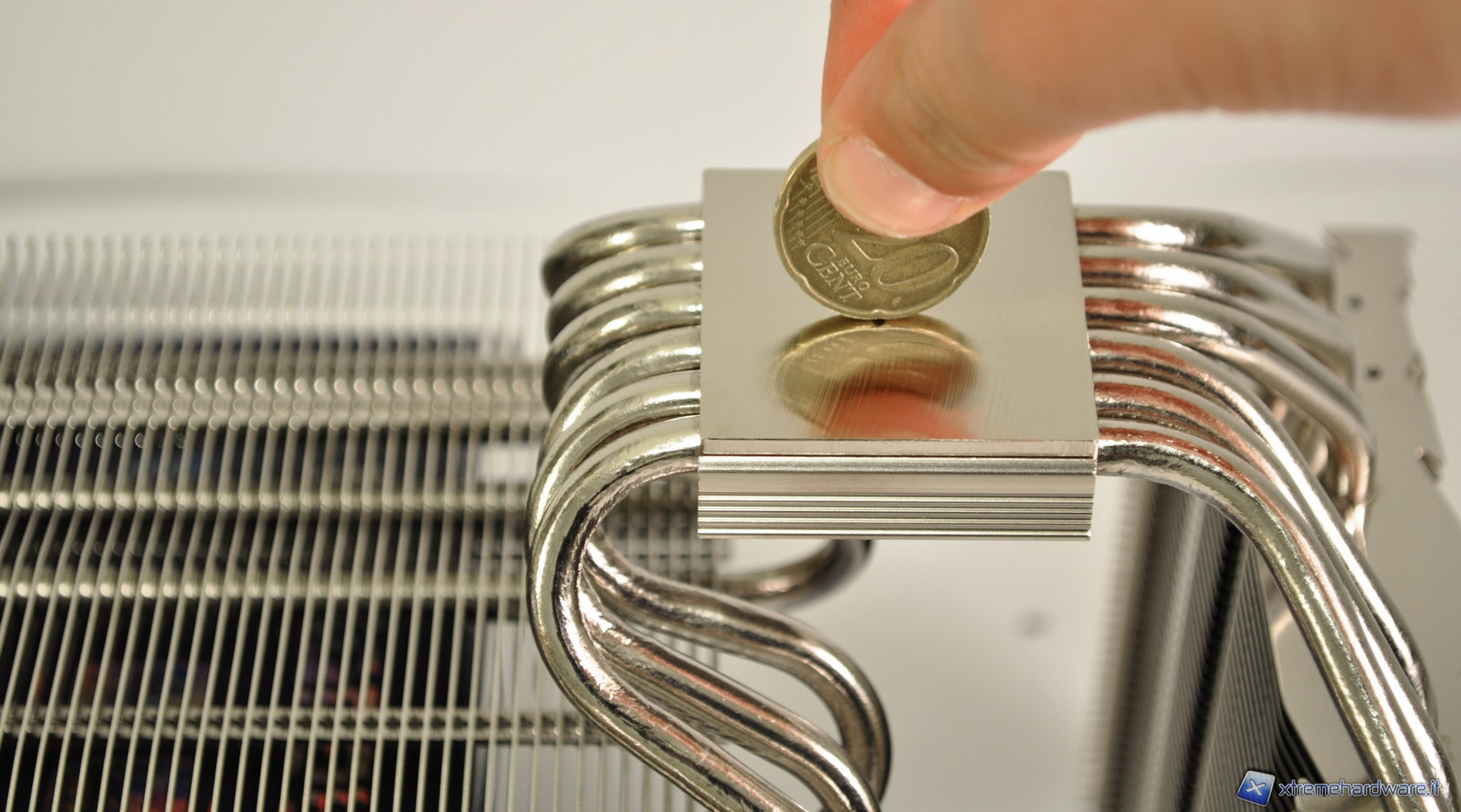 La base del dissipatore a diretto contatto con l’IHS del processore è costruita in rame nichelata e le heat-pipes sono saldate direttamente alla base stessa con l’apposita lega.