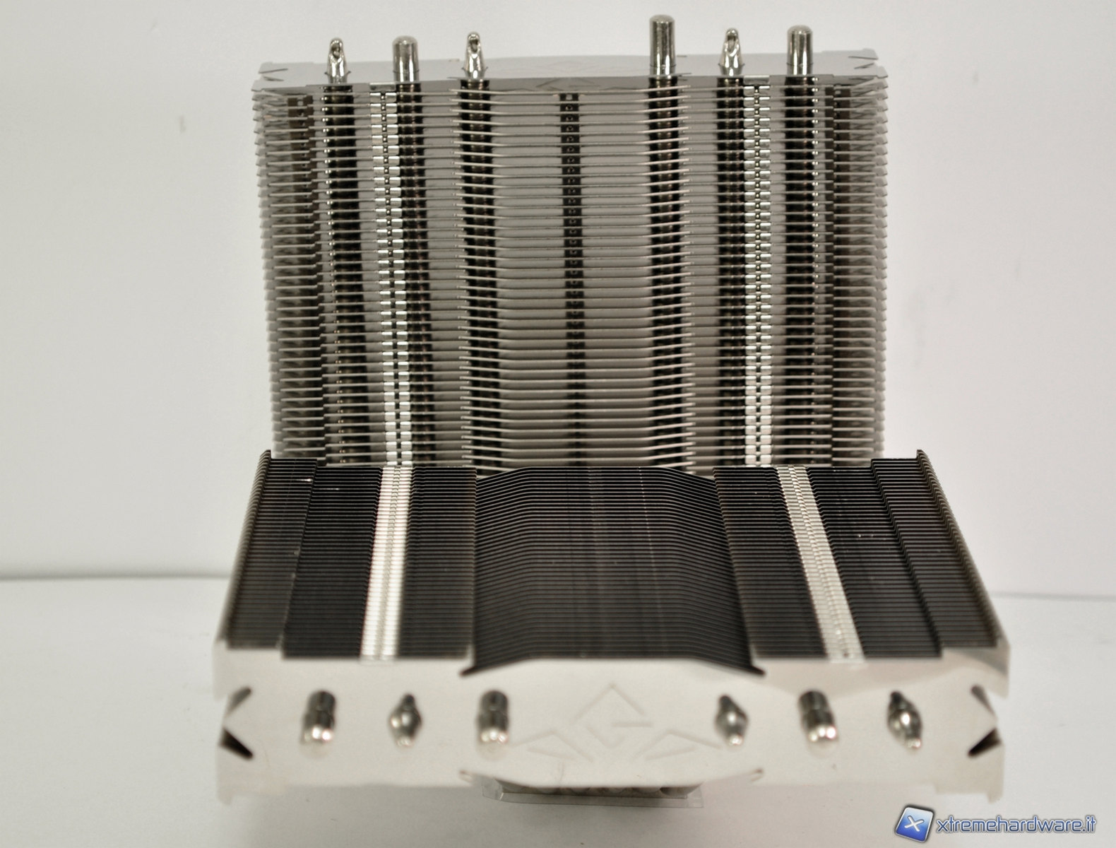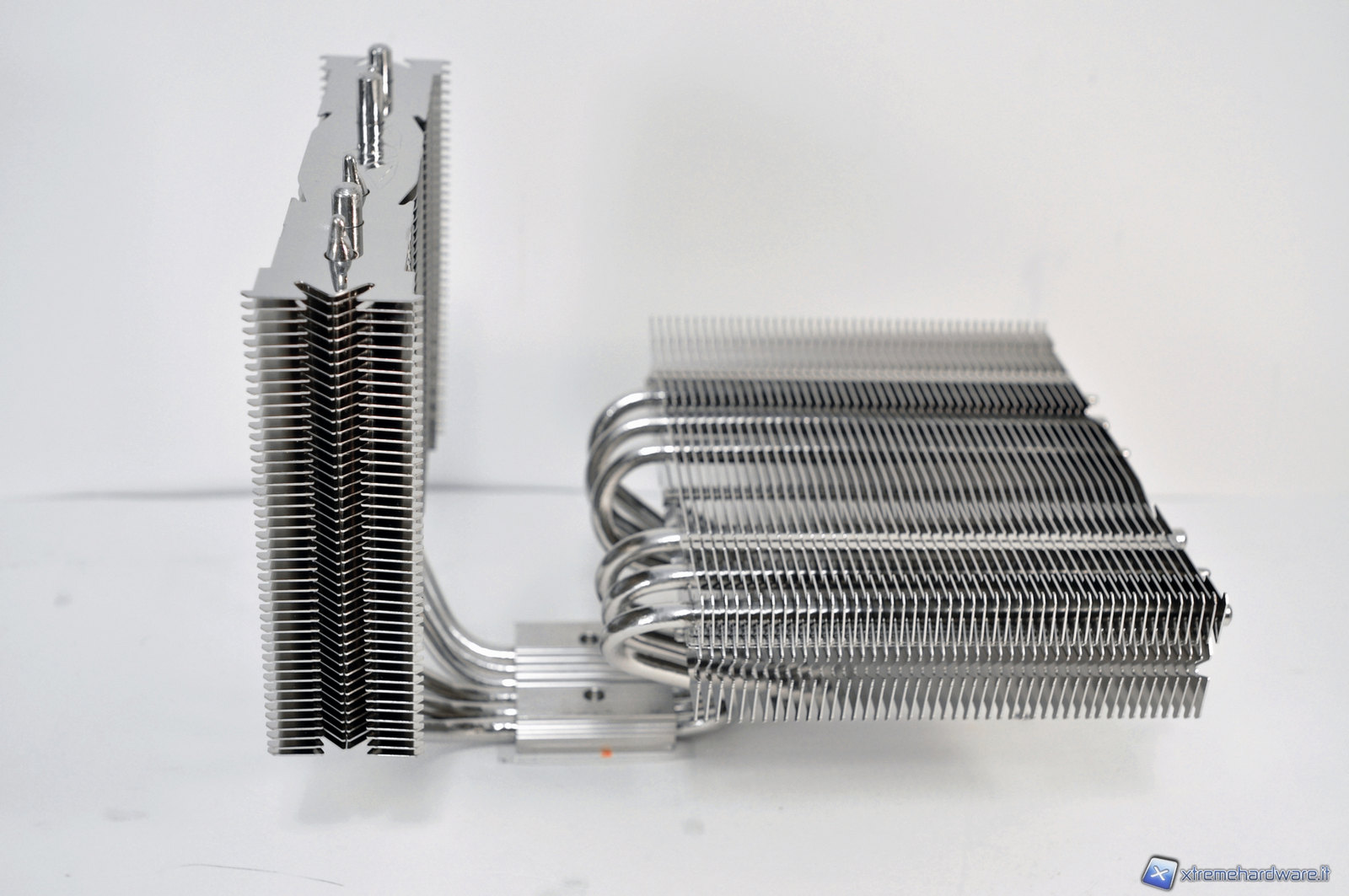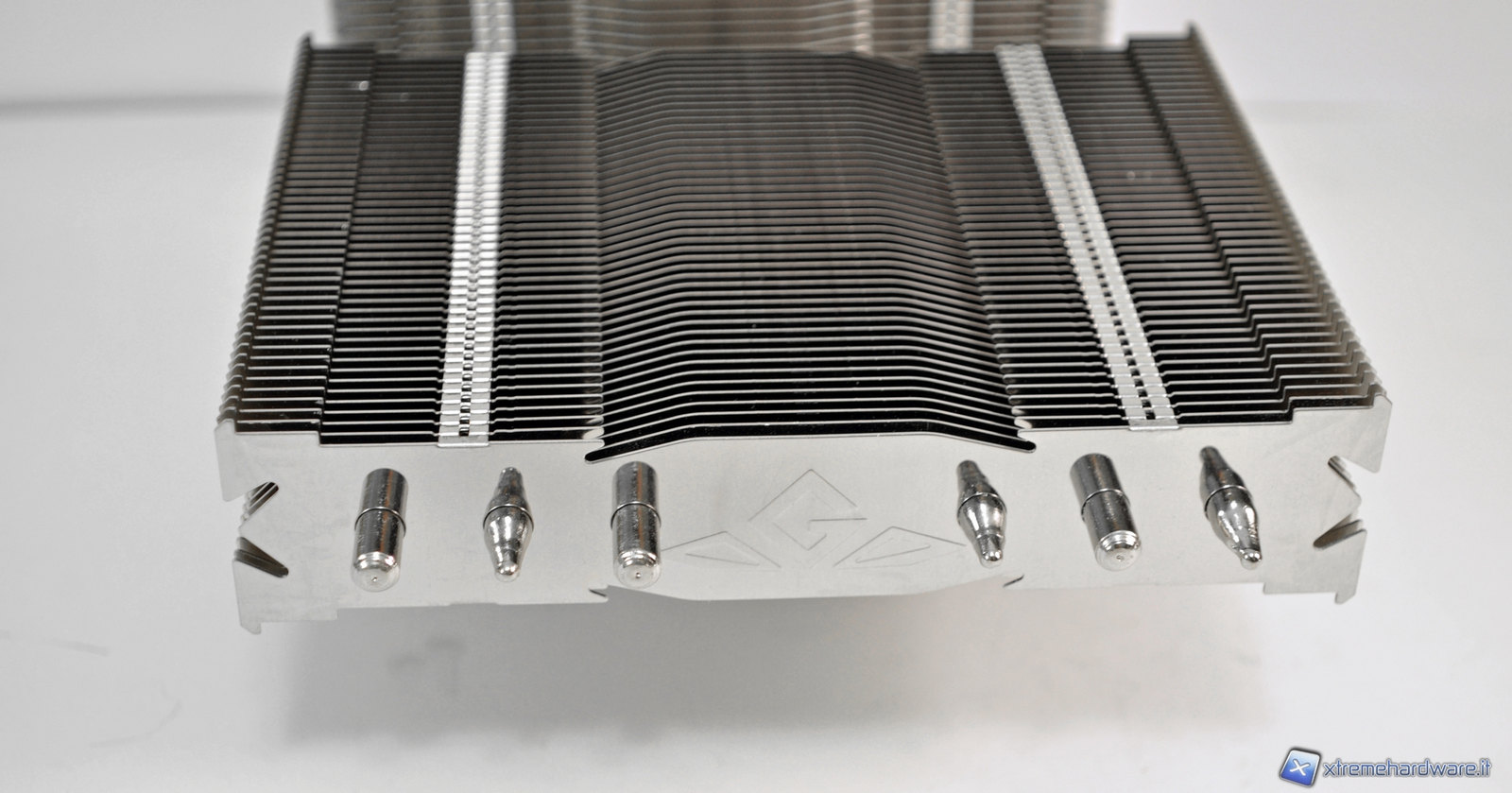 Le alette del dissipatore sono lucidate a specchio e nella struttura dissipante orizzontale possiamo trovare il logo della casa produttrice. In ogni struttura dissipante troviamo 45 alette, per un totale di 90, che sono saldate tramite l’ausilio di una lega di stagno ed argento priva di piombo, allo scopo di massimizzare le prestazioni. Rompere accidentalmente un’aletta risulterà quindi molto difficile.