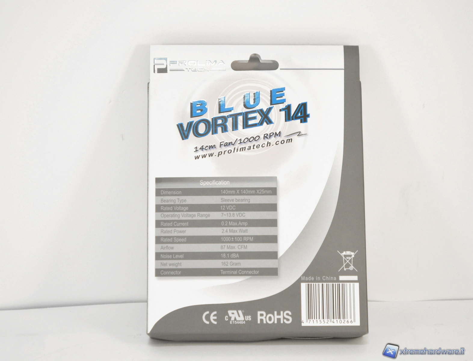 Le ventole in dotazione con il Genesis sono delle Blue Vortex da 140 mm. Le ventole sono custodite in una confezione cartonata, dove sul fronte è rappresentato un vortice e sul retro le caratteristiche tecniche delle ventola: velocità fissa di 1000 RPM, rumorosità di soli 18.1 dB(A) e portata d’aria di 87 CFM.