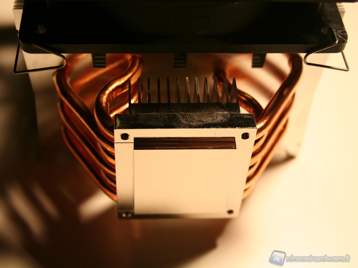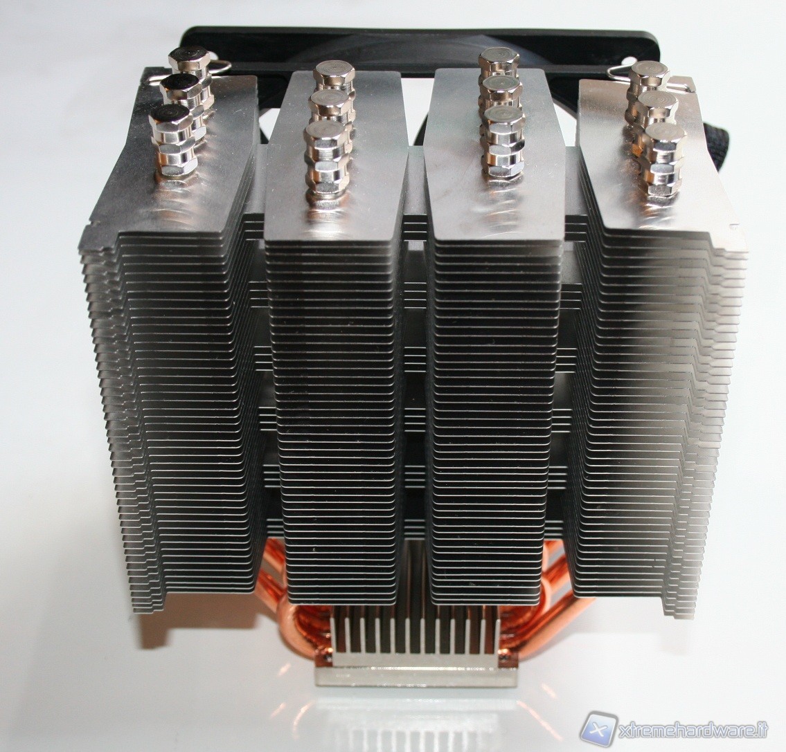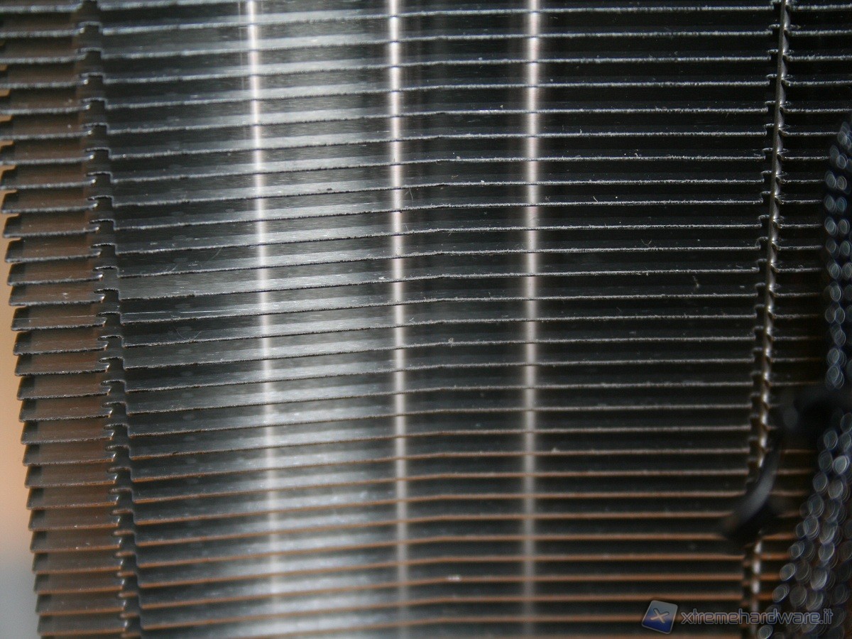 Non sono presenti gommini antivibrazione sulla ventola ed il dissipatore non è stato concepito per migliorare la dissipazione né delle componenti onboard della scheda madre, né delle RAM, ma questa è una peculiarità di tutti i dissipatori a torre il cui obiettivo è di massimizzare l’efficienza del dissipatore sfruttando i flussi d’aria interni del case. Notiamo infine che la ventola è leggermente distaccata, nella parte centrale, dal corpo dissipante, questo, insieme al motore di ridotte dimensioni della ventola Slip Stream, permette un flusso omogeneo nel corpo dissipante, evitando il classico vuoto d’aria nella parte centrale dovuto al “cono d’ombra” del motore.