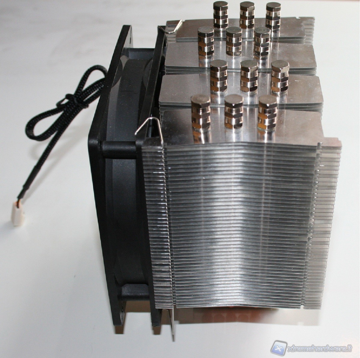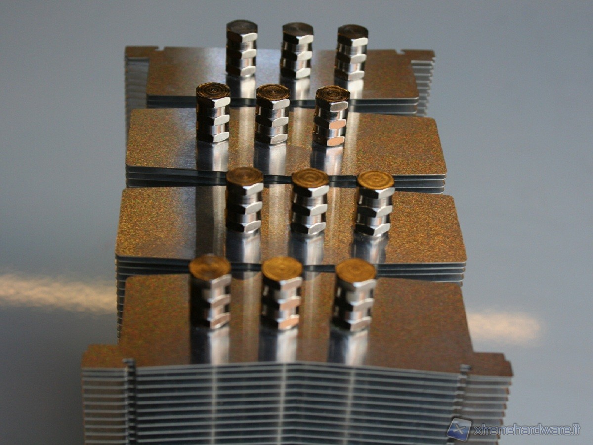 Analizzando la disposizione delle heatpipe stesse sul corpo radiante, notiamo che non sono poste sulla stessa linea bensì sfalsate a blocchi di 2. Questo permetterà un'ottimale aerazione delle stesse, cosa che non sarebbe stata possibile qualora fossero state parallele. Indubbiamente sono stati svolti parecchi studi nel campo della dissipazione termica e riteniamo che il sistema M.A.P.S. sia davvero interessante, sebbene forse non sia adatto a configurazioni senza ventola, in quanto, per come è concepito, è di fondamentale importanza che ci sia un flusso d'aria costante. A testimonianza di questo basti pensare al flusso della ventola stessa, di cui riportiamo i dati :