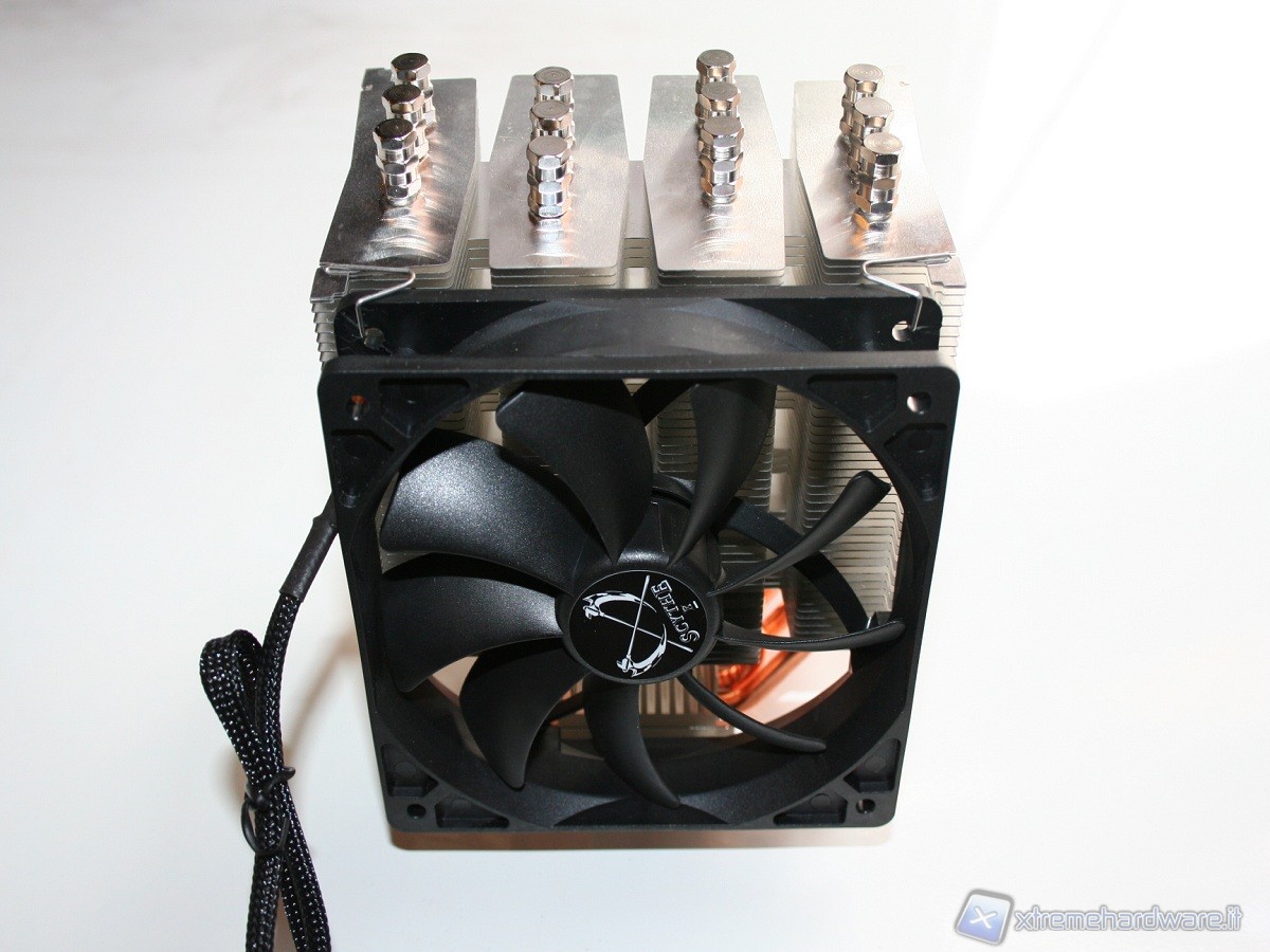 Il dissipatore presenta sei heatpipe aventi la classica struttura ad U, con un diametro di sei millimetri. La superficie totale dissipante è caratterizzata da 48 lamelle in alluminio ripartite in quattro torri, connesse nella parte centrale da un unico corpo orizzontale. Altro aspetto interessante, e caratteristico delle soluzioni Scythe, è il corpo dissipante adottato proprio sopra la placca basale di contatto con la CPU, immediatamente sopra le heatpipe. Questa soluzione permette di ottenere una dissipazione termica ottimale anche con CPU aventi TDP ridotto, quindi in situazioni di basso carico; questo, a testimonianza di quanto affermato precedentemente, ovvero che Scythe ha cercato di rendere questo prodotto il più completo possibile.