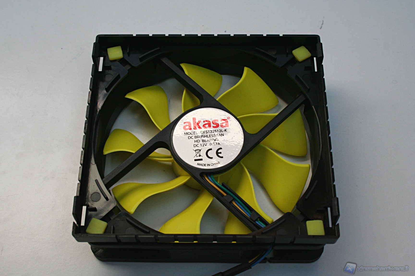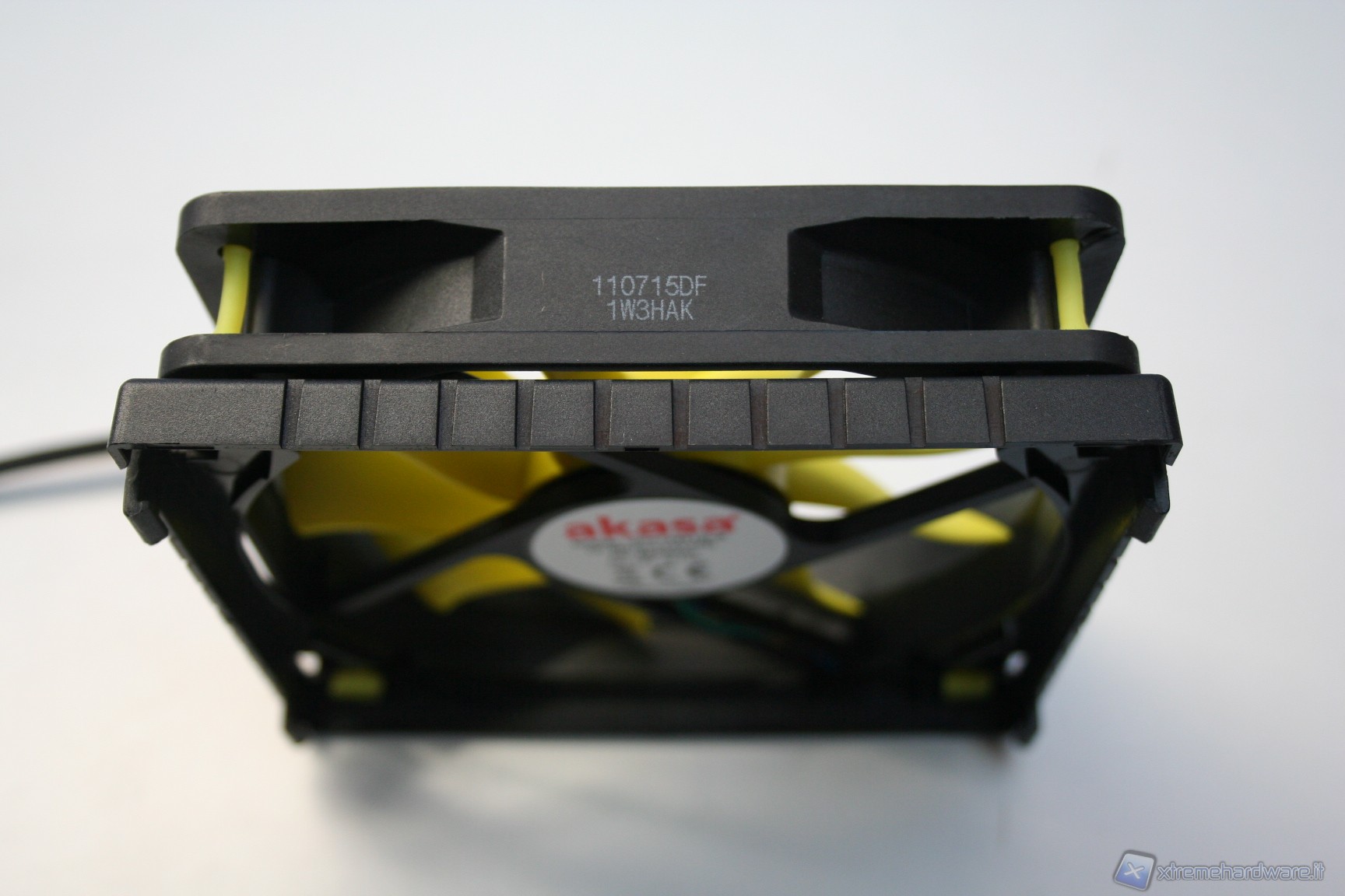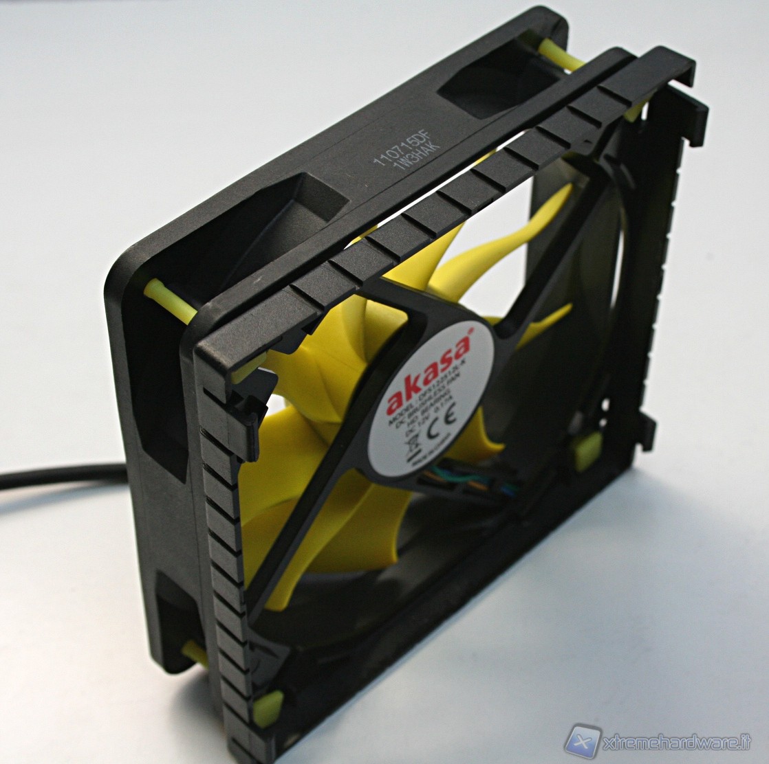 Nella parte superiore c’è una copertura di plastica dura con il logo Akasa sovrapposta ad una copertura a griglia metallica con colorazione gialla, tutto ciò conferisce un aspetto molto aggressivo e davvero di impatto. Il radiatore presenta delle lamelle sufficientemente spaziate (spesse 0.5mm e spaziate 2mm), di modo che il flusso d’aria non venga eccessivamente ostruito. Con questa struttura ci sono pochissime zone morte dove l’aria non riesce a passare, precisamente dietro ognuna delle heatpipe; in linea teorica potrebbe venire a formarsi un piccolo triangolo non areato, ma comunque è un discorso valido per una buona parte dei dissipatori attualmente in commercio quindi nulla di preoccupante. Le heatpipes sono in rame e le alette in alluminio.