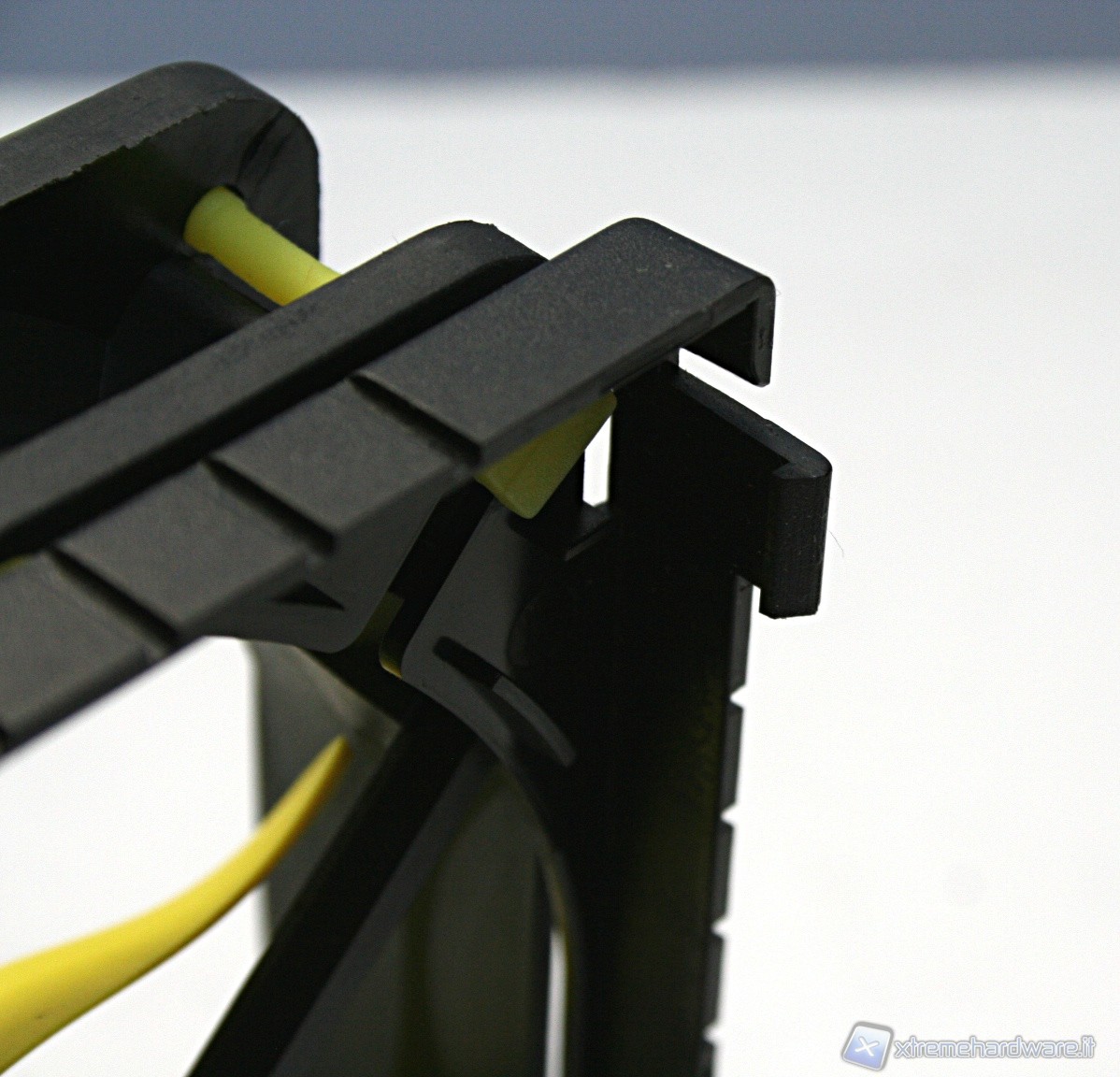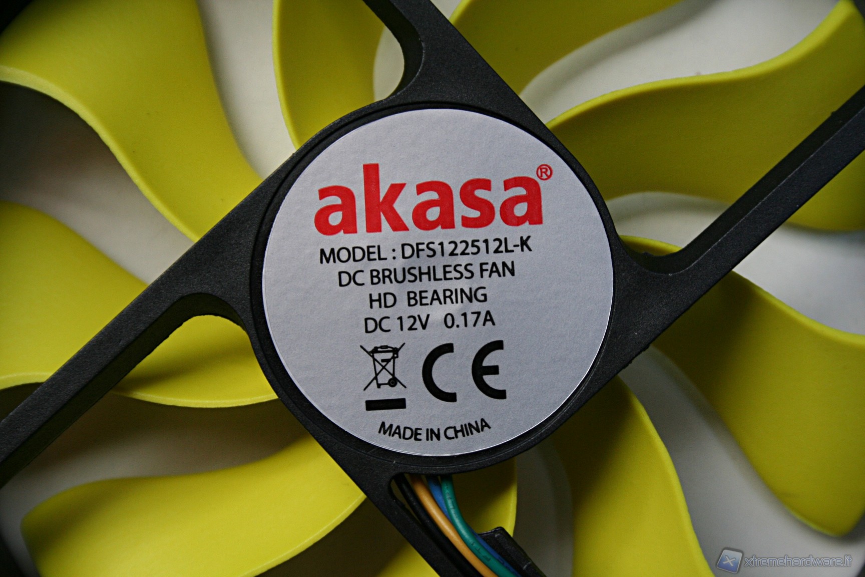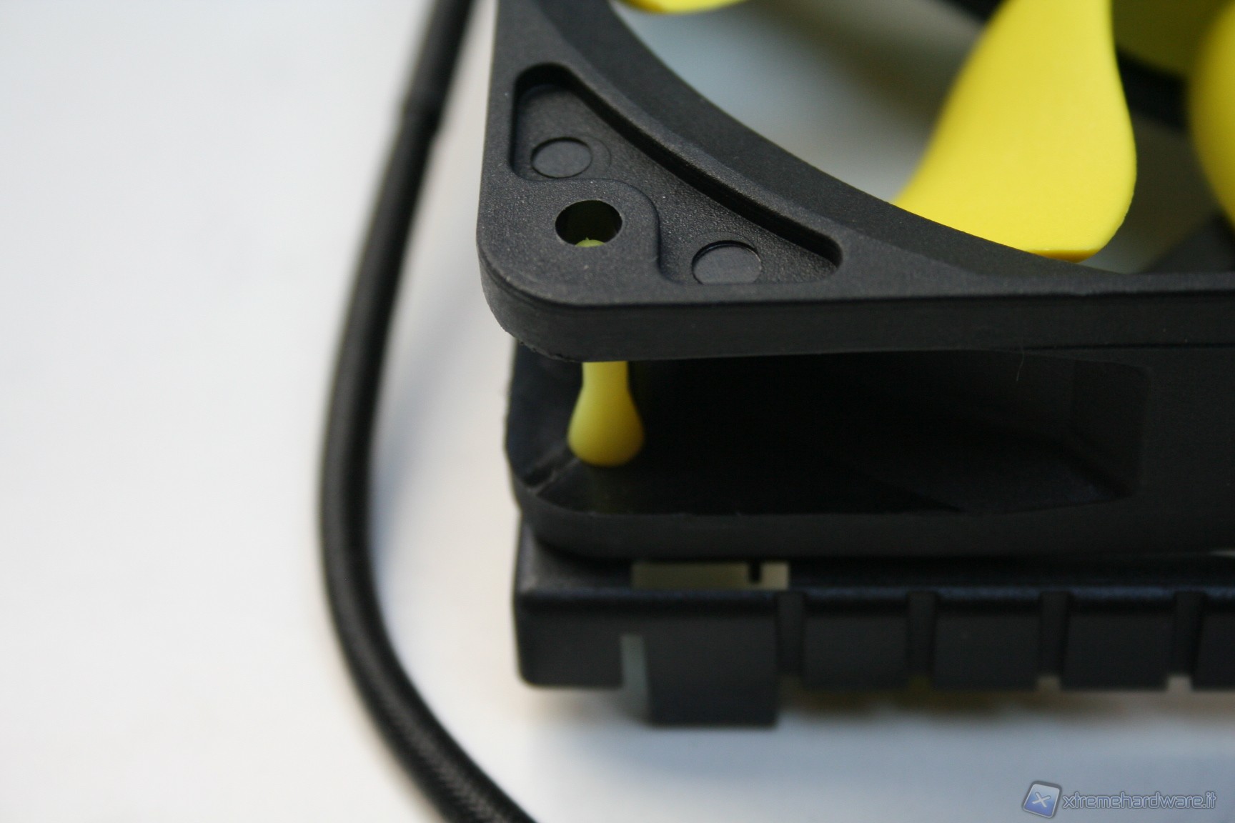 Nella parte superiore c’è una copertura di plastica dura con il logo Akasa sovrapposta ad una copertura a griglia metallica con colorazione gialla, tutto ciò conferisce un aspetto molto aggressivo e davvero di impatto. Il radiatore presenta delle lamelle sufficientemente spaziate (spesse 0.5mm e spaziate 2mm), di modo che il flusso d’aria non venga eccessivamente ostruito. Con questa struttura ci sono pochissime zone morte dove l’aria non riesce a passare, precisamente dietro ognuna delle heatpipe; in linea teorica potrebbe venire a formarsi un piccolo triangolo non areato, ma comunque è un discorso valido per una buona parte dei dissipatori attualmente in commercio quindi nulla di preoccupante. Le heatpipes sono in rame e le alette in alluminio.