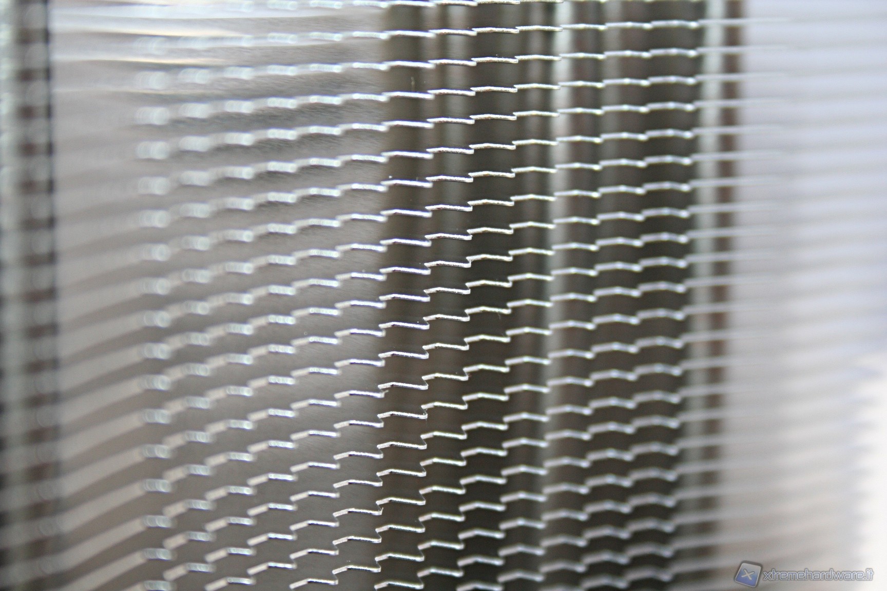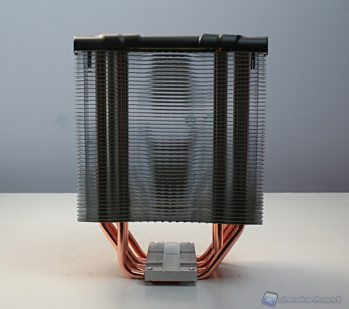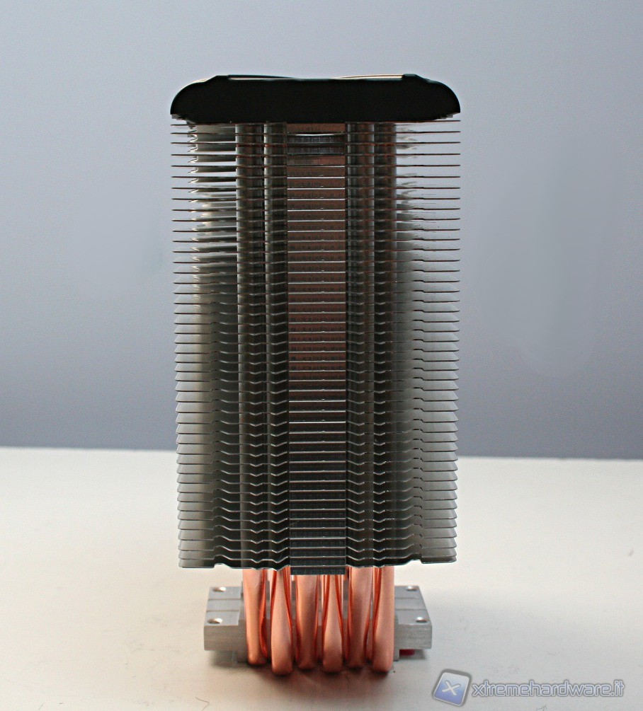 Il dissipatore presenta sei heatpipe aventi la classica struttura ad U, con un diametro di sei millimetri. La superficie dissipante è caratterizzata da 45 lamelle in alluminio ripartite in un’unica torre. Notiamo delle rientranze centrali triagolari che formano una mezzaluna dentellata e concava, sul lato di entrata dell’aria. Nel lato opposto invece è presente una struttura convessa, sempre avente queste rientranze triangolari.