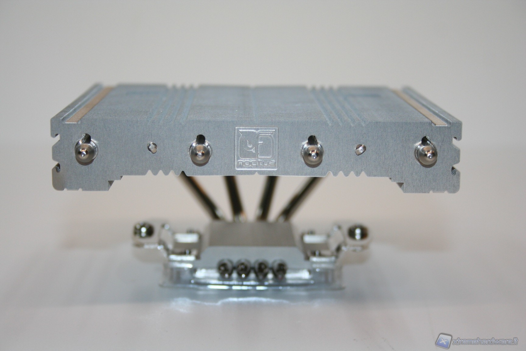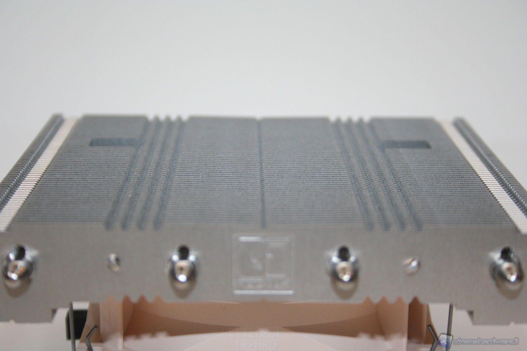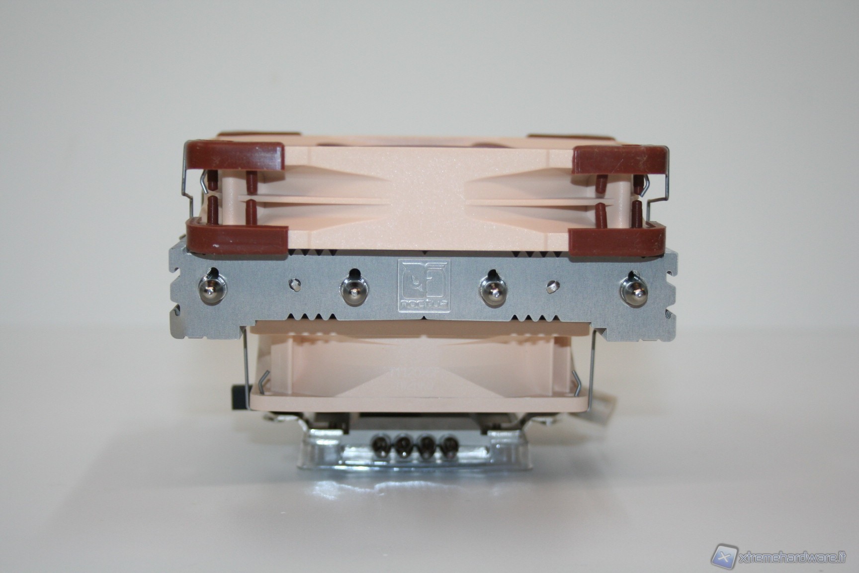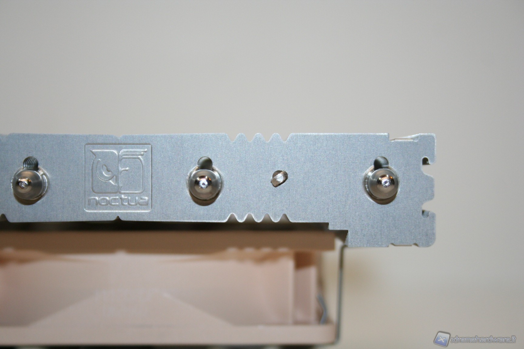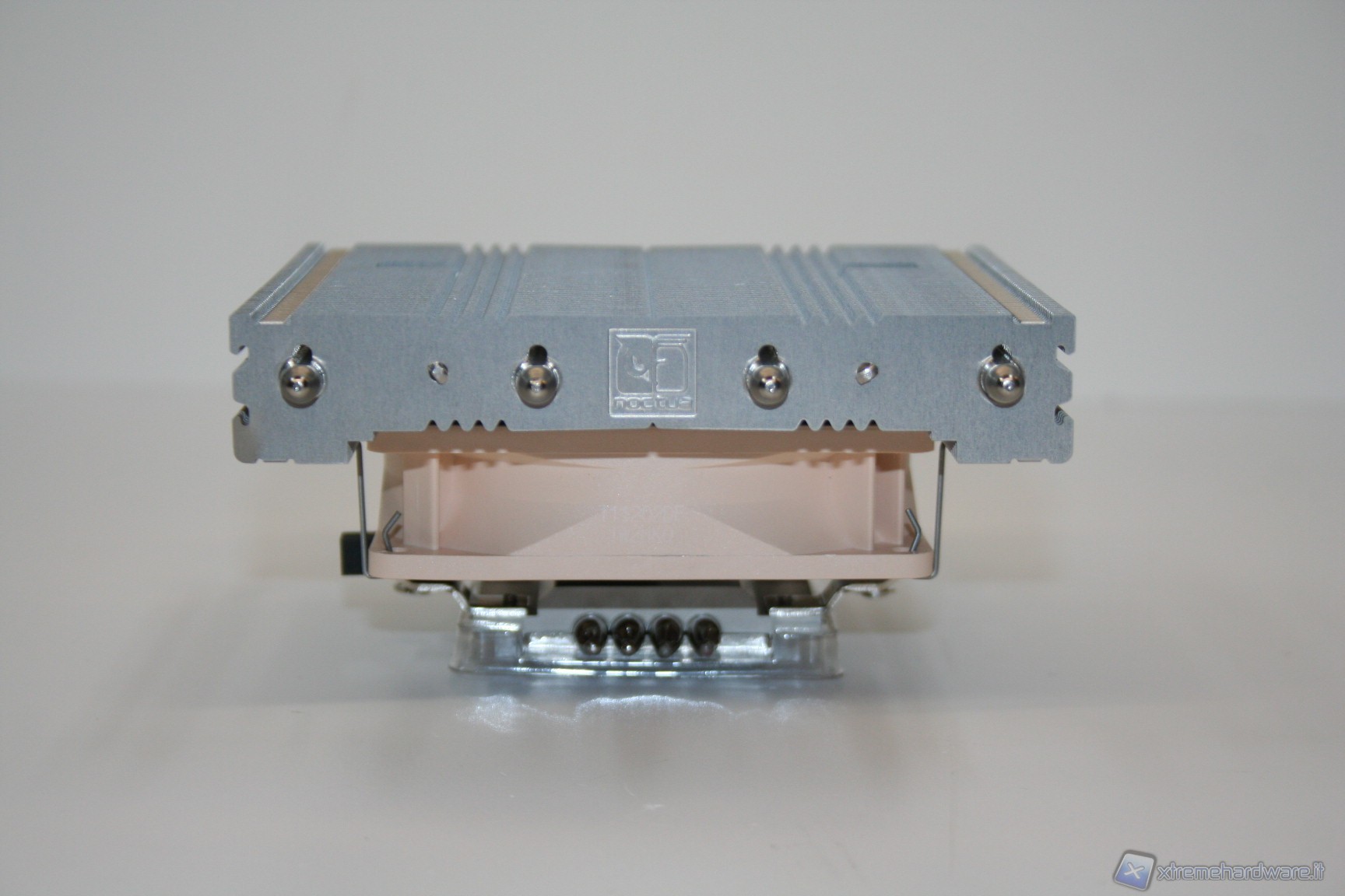 La base di contatto presenta un’ottima finitura nickelata, proprietaria Noctua, ed inoltre è presente anche una leggerissima curvatura centrale convessa, che migliora l’impronta di contatto della CPU, cercando di ovviare al ben noto problema del sistema di ritenzione INTEL che spesso porta ad una curvatura del socket. E’ ancorato alla struttura il sistema di fissaggio orizzontale, con le due viti già installate.