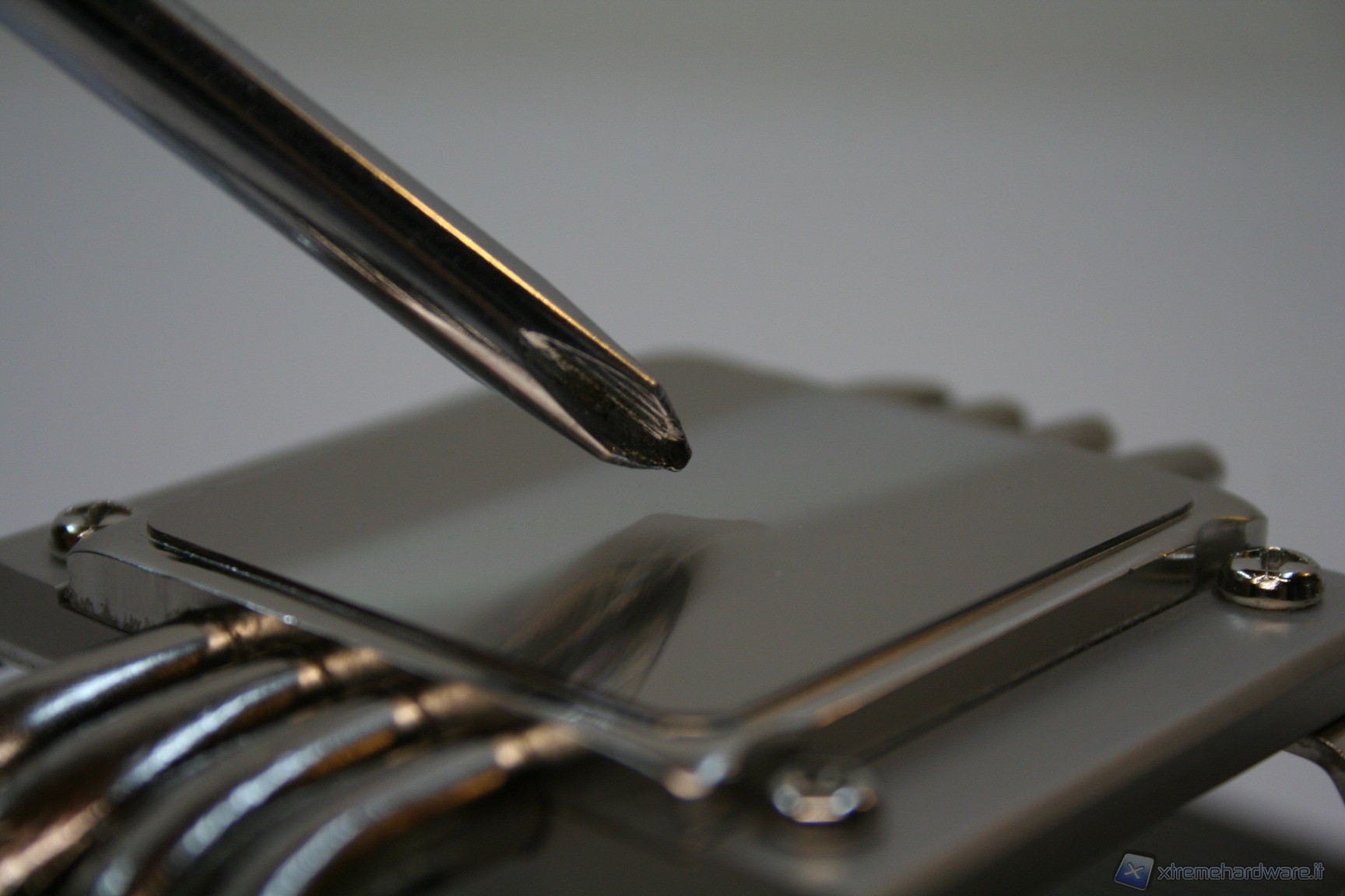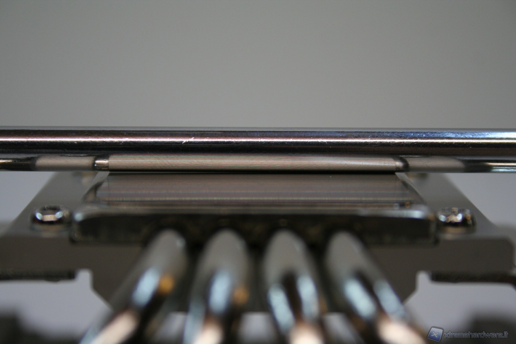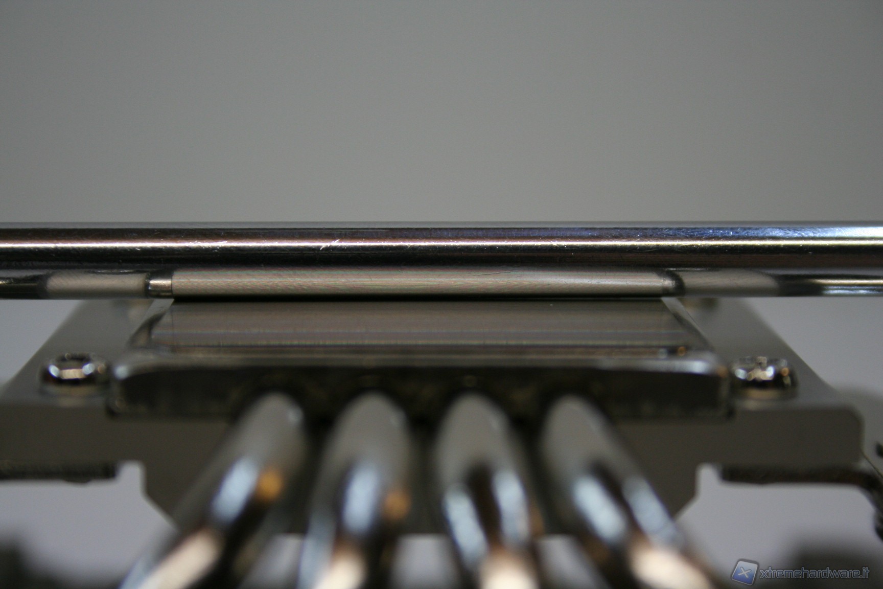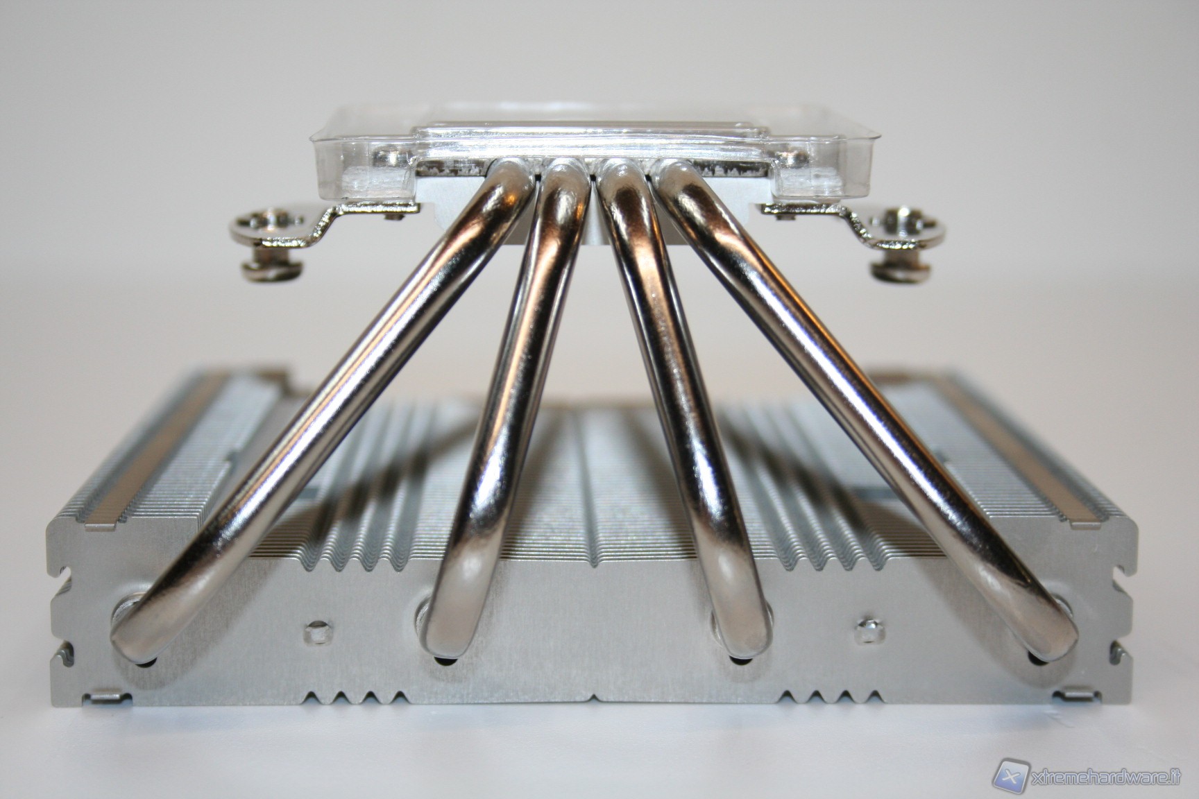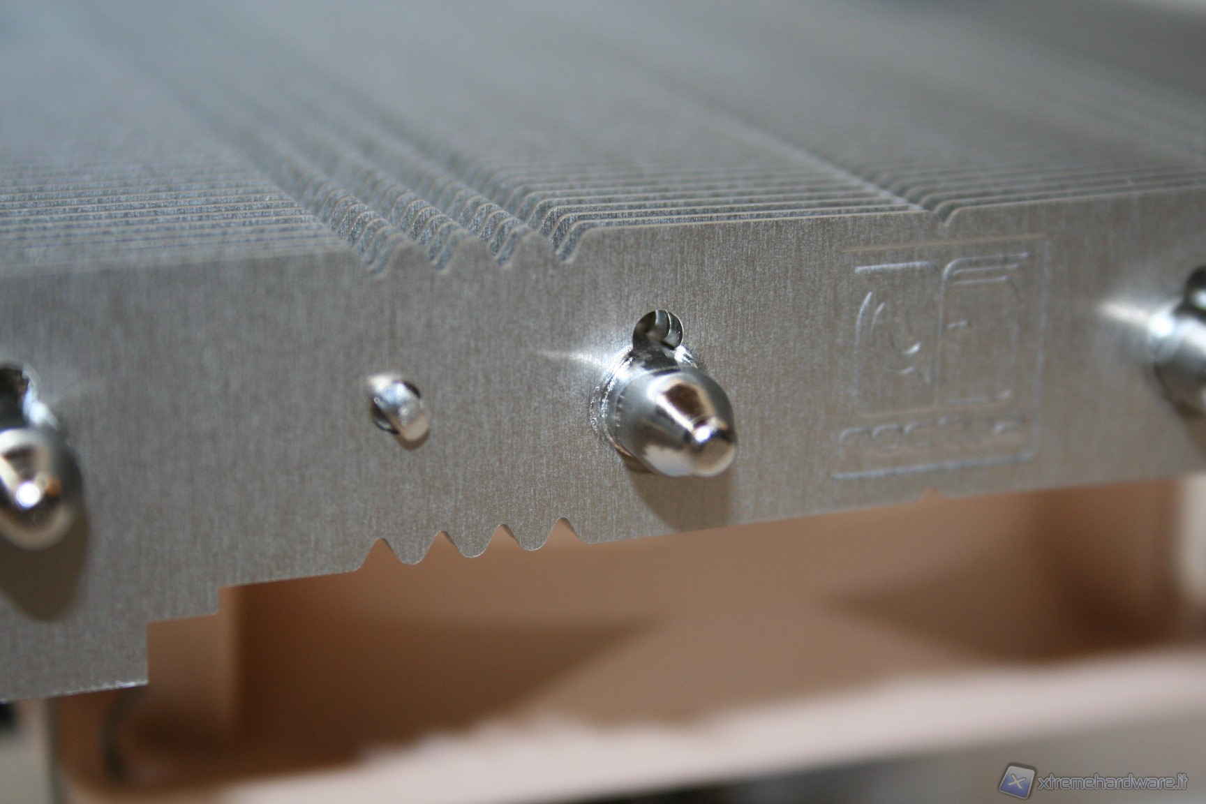 La base di contatto presenta un’ottima finitura nickelata, proprietaria Noctua, ed inoltre è presente anche una leggerissima curvatura centrale convessa, che migliora l’impronta di contatto della CPU, cercando di ovviare al ben noto problema del sistema di ritenzione INTEL che spesso porta ad una curvatura del socket. E’ ancorato alla struttura il sistema di fissaggio orizzontale, con le due viti già installate.