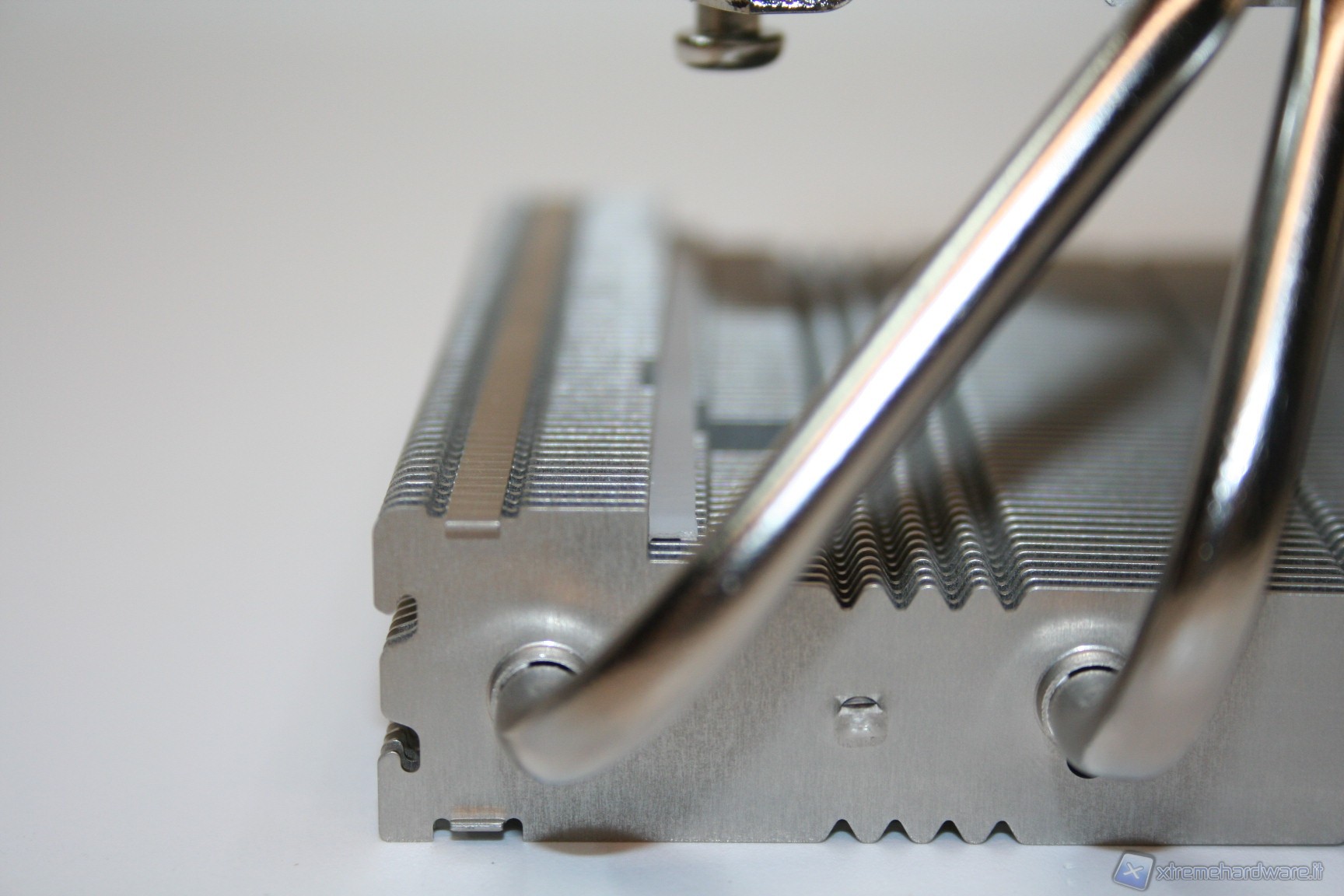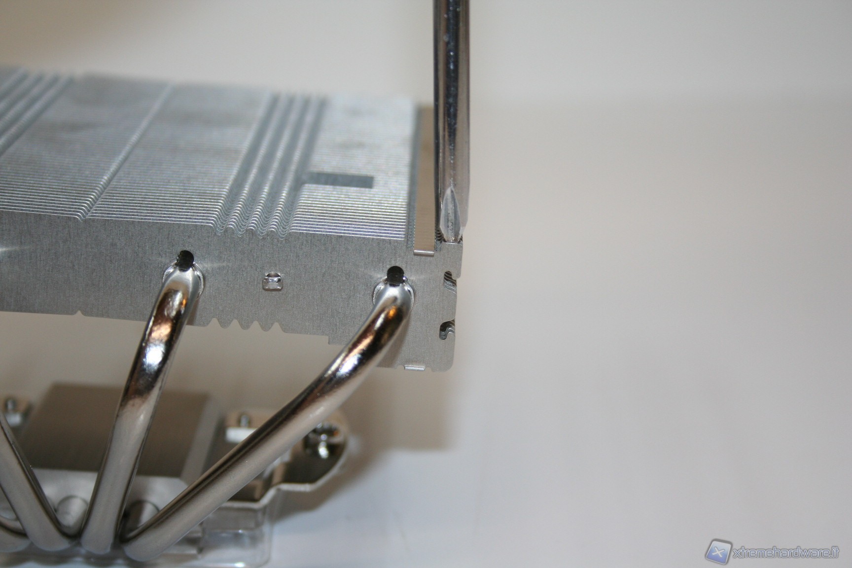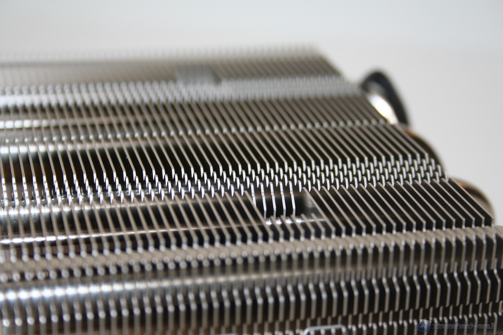 La spaziatura tra le alette è molto serrata e questo potrebbe portarci a pensare che forse sarebbe necessario l’utilizzo di ventole dall’elevata pressione statica, anche se c’è da precisare che lo spessore è ridotto. Dopo aver effettuato i test di temperatura confermiamo che saranno necessarie ventole dall’elevata pressione statica, infatti come vedremo c’è un’interessante differenza tra la Noctua NF-F12 e la vecchia, seppure ottima, versione NF-P12. La spaziatura ristretta però permette di aumentare la superficie dissipante, il che significa che questo design ha portato, perlomeno in linea teorica, a migliorare le performance rispetto a soluzioni dall’analoga grandezza ma con alette più spaziate.