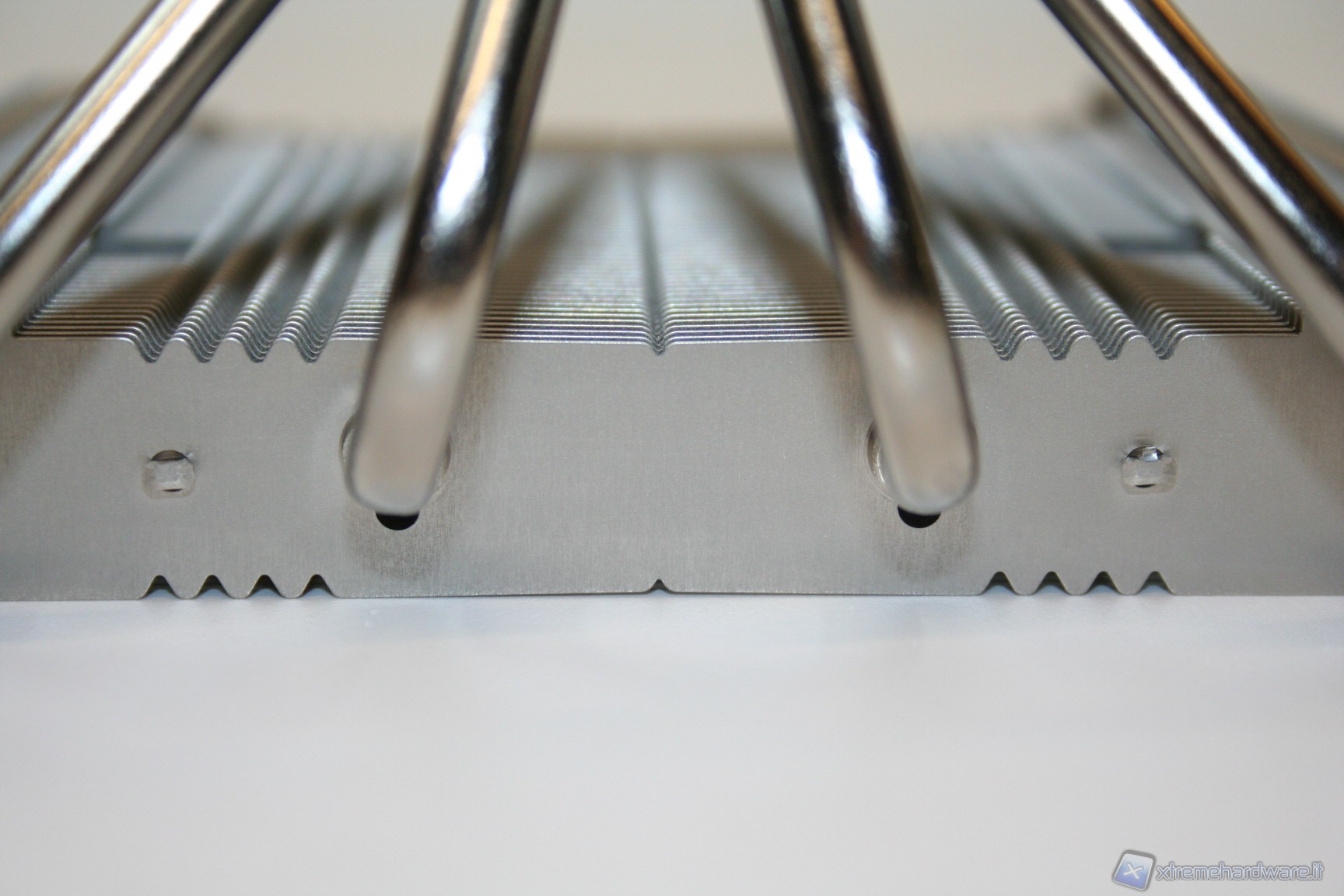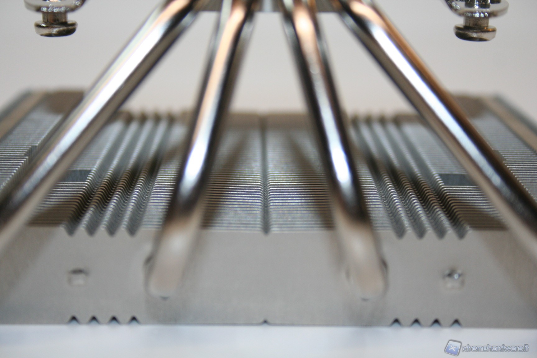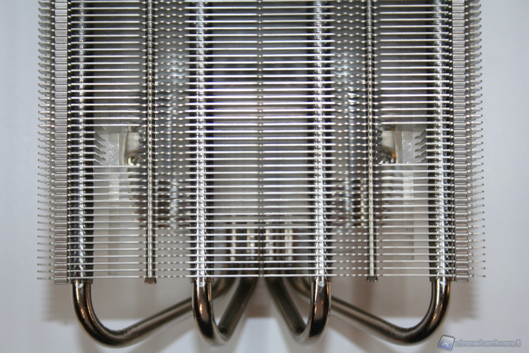 La spaziatura tra le alette è molto serrata e questo potrebbe portarci a pensare che forse sarebbe necessario l’utilizzo di ventole dall’elevata pressione statica, anche se c’è da precisare che lo spessore è ridotto. Dopo aver effettuato i test di temperatura confermiamo che saranno necessarie ventole dall’elevata pressione statica, infatti come vedremo c’è un’interessante differenza tra la Noctua NF-F12 e la vecchia, seppure ottima, versione NF-P12. La spaziatura ristretta però permette di aumentare la superficie dissipante, il che significa che questo design ha portato, perlomeno in linea teorica, a migliorare le performance rispetto a soluzioni dall’analoga grandezza ma con alette più spaziate.