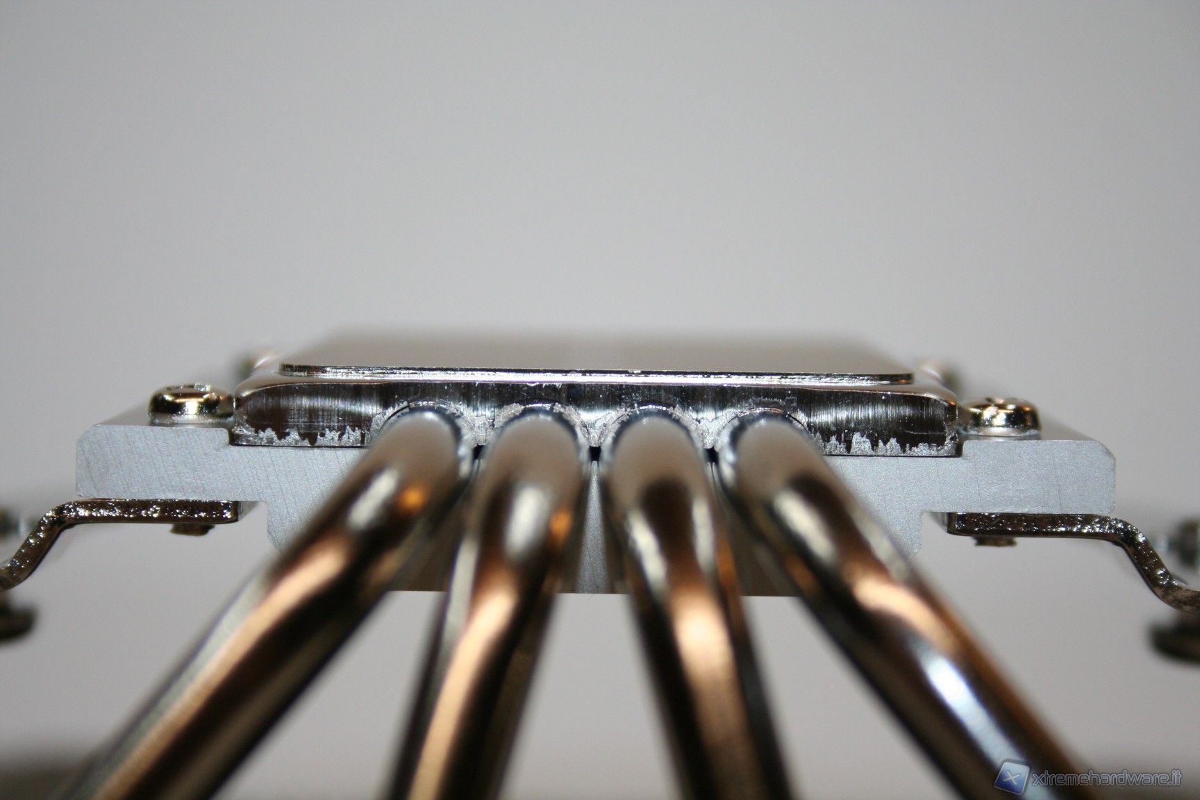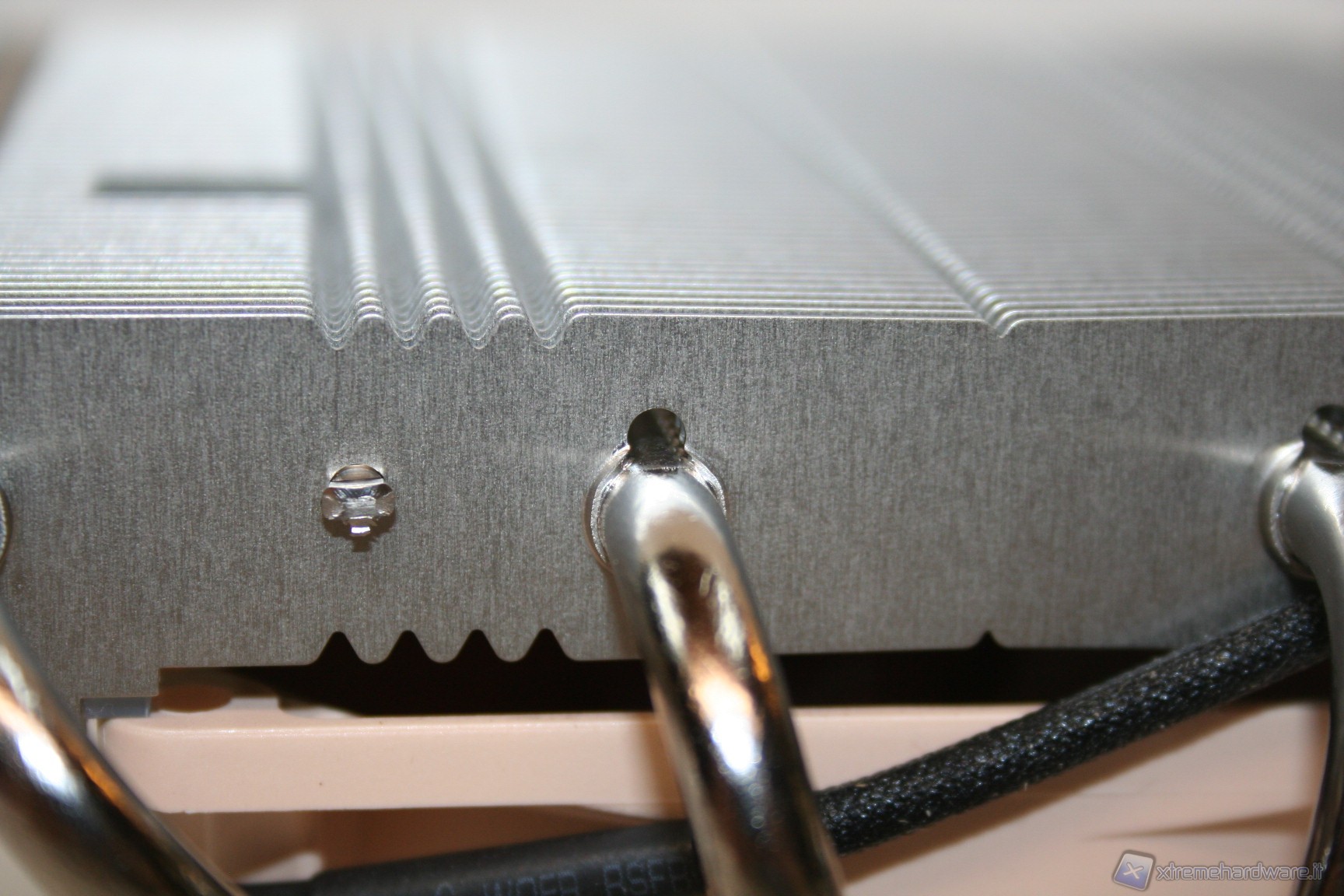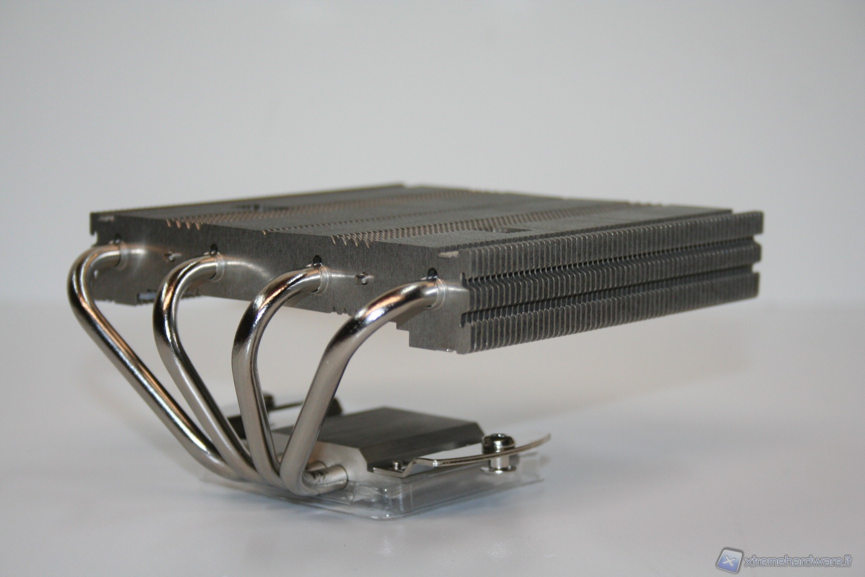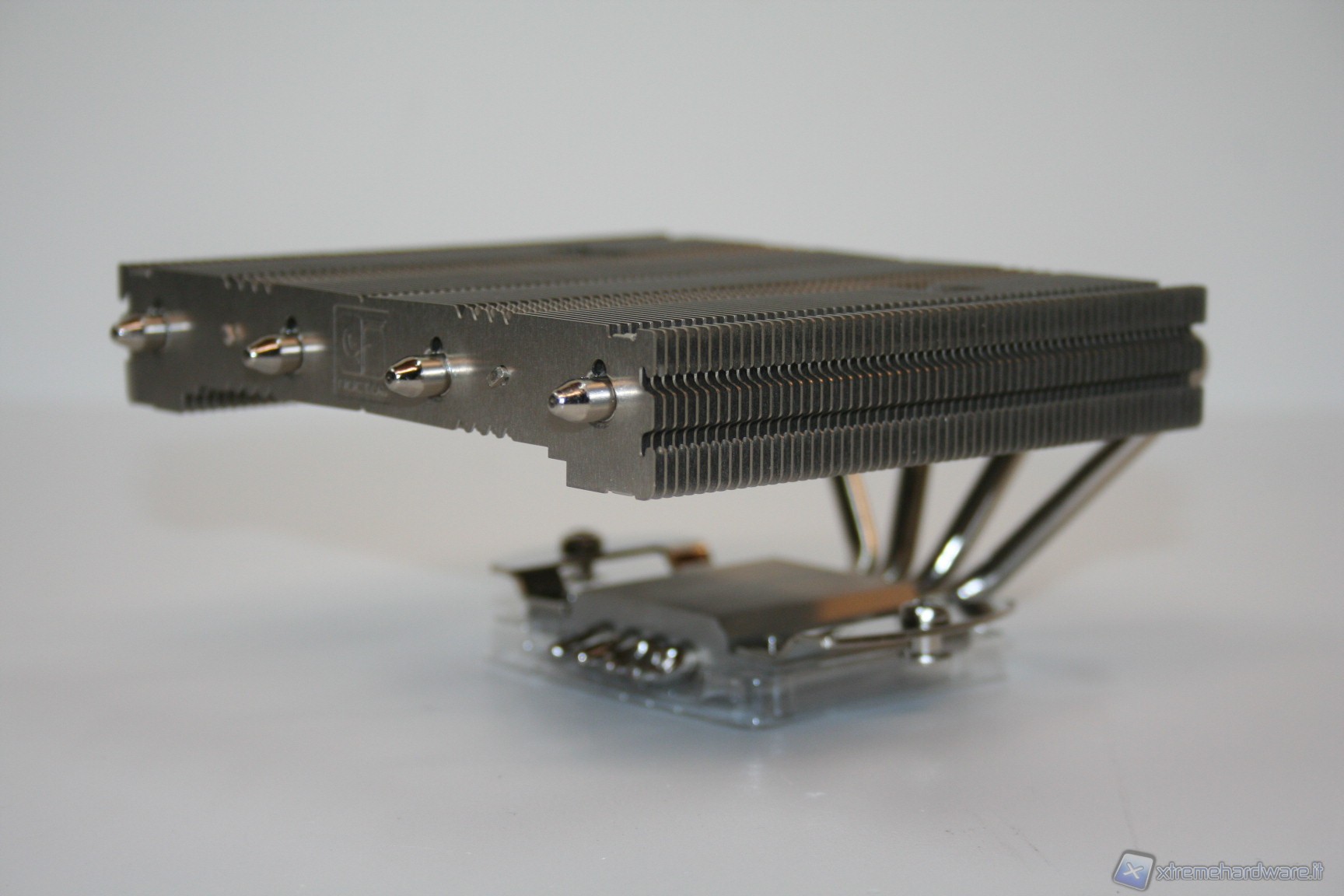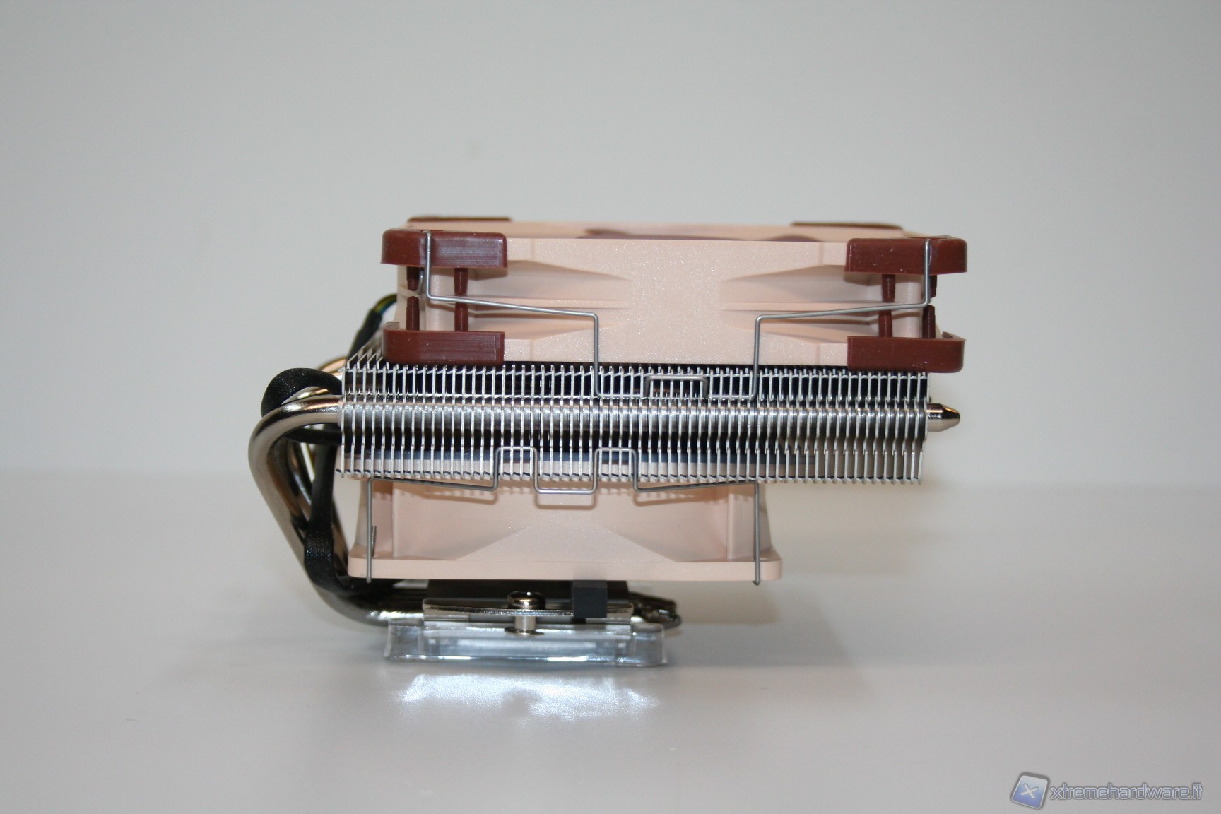 Sono presenti quattro heatpipes da 6mm di diametro, dalla finitura in Nickel e dall’ottima qualità complessiva. Presentano una scudatura terminale uniforme e sono saldate alle alette quindi ci sarà un’efficienza di scambio di calore migliore rispetto alla sola punzonatura. La superficie dissipante è piuttosto ridotta per riuscire a gestire CPU particolarmente potenti, ma risulta ottima se parametrata a CPU dal basso consumo, ovvero la tipologia di processori per cui è stato ideato questo nuovo modello.