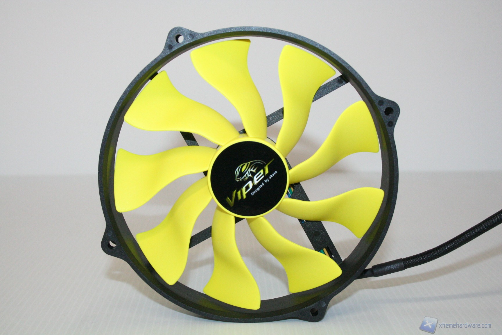 Le ventole Viper invece sono caratterizzate da una struttura molto particolare, che tra l’altro abbiamo avuto già il piacere di recensire in passato, sommariamente, nel corso di diverse recensioni. Presentano una tipologia delle pale potenziata nel numero e nella tipologia, ed un motore di ottima qualità, che unito alla PulseWidthModulation (PWM) come per le Piranha, permette una fine regolazione degli RPM. La presenza di nove pale permette di ottenere valori di CFM maggiori rispetto al normale, anche grazie la loro struttura ondulata che porta ad una concentrazione dell’aria dinanzi al motore. Il motore presenta un MTBF di 50.000h quindi superiore rispetto allo standard(circa 30.000h), ciò è dovuto all’adozione di un sistema di rotazione di tipo Hydro Dynamic Bearing. Il motore presenta un diametro standard e non è stata curata quindi l’ottimizzazione laminare, che generalmente tende ad evitare la creazione di una piccola zona morta proprio sotto il bordo superiore del motore stesso. Questo porterà ad un leggero peggioramento dei CFM, in relazione al frame con angoli netti che di fatto tagliano il flusso d’aria e ne impediscono l’inserimento, in prossimità del centro della ventola. Si presentano con un telaio in ABS, avente una struttura ottimizzata per l’installazione su supporti per ventole da 120mm, nonostante il diametro sia di 140mm. Il corpo della ventola è di colorazione nera mentre le pale sono giallo certosa (leggermente più scuro quindi del giallo acido/zolfo). Non è possibile staccare queste ultime dal corpo principale.