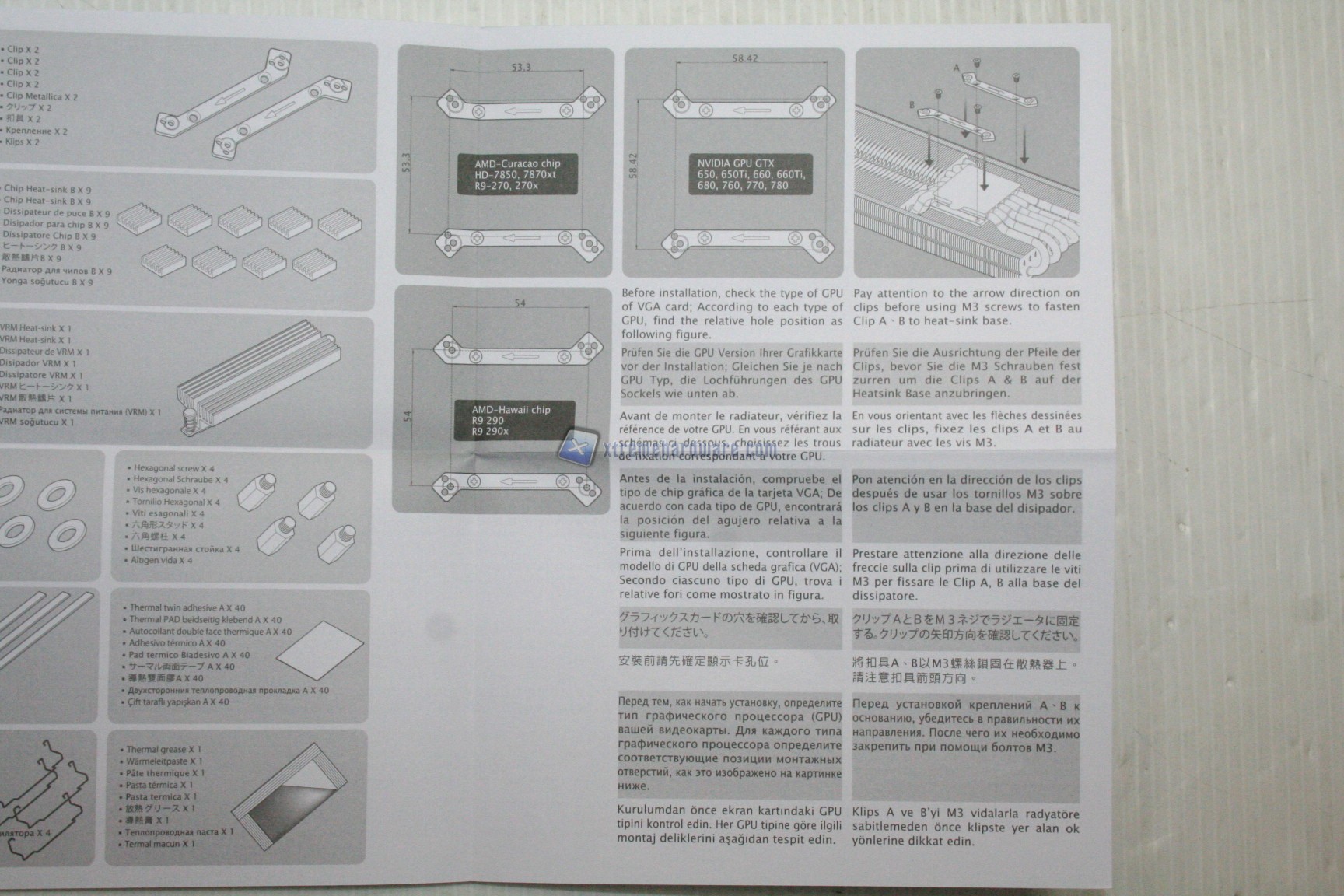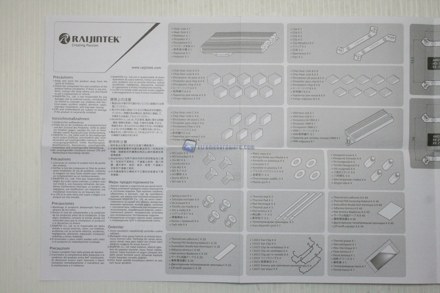 Il bundle è ottimo anche se c’è una mancanza per quanto riguarda le schede video della serie R9 290: sarebbero stati necessari almeno 10 dissipatori per RAM quadrati invece degli 8 forniti, ma non ultimo per importanza sarebbe stato assolutamente necessario inserire dei dissipatori passivi con una base non superiore a 4/5mm, poiché purtroppo per come viene fornito non sarà possibile dissipare una serie di chip posti in alto a sinistra, sul PCB della R9 290/X. A conti fatti è un grave handicap, a cui abbiamo ovviato con altri modelli, ma per utenti medi/esperti sarà comunque necessario porre rimedio. Abbiamo già segnalato il problema a Raijintek, pertanto ci auguriamo che tale mancanza verrà risolta molto presto.