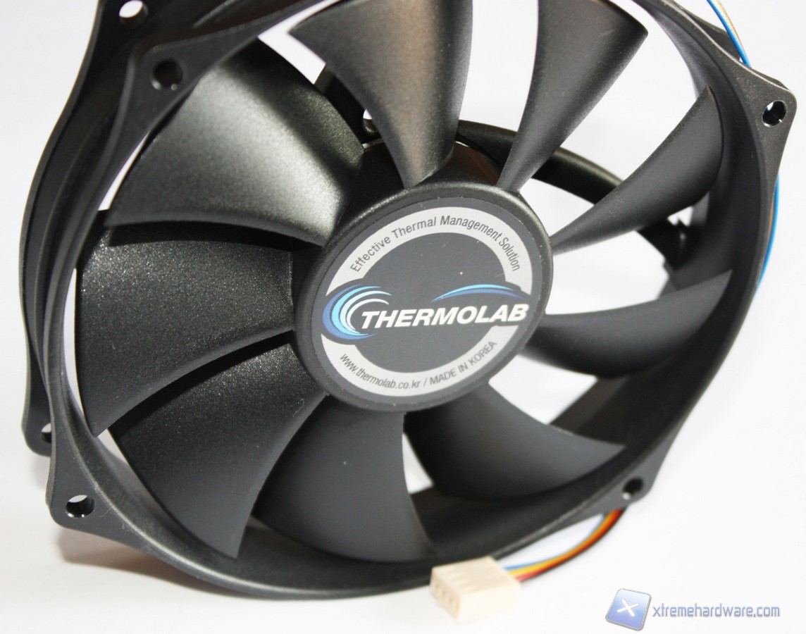 Detto questo passiamo all’analisi del modello ADDA AR1212LX-A9BGL. La ventola in dotazione al Trinity è come detto da 130 mm ed appartiene alla tipologia PWM. La colorazione è la classica nera per l’intero corpo. Il connettore PWM a 4 pin permetterà di variare la velocità di rotazione, in maniera automatica, in base al carico della CPU. Il cavo del connettore PWM non è rivestito in treccia di tessuto ma per la tipologia e la destinazione di utilizzo non è strettamente necessario. Il disegno non è classico ma ha una forma circolare. Questo potrebbe portarvi a pensare che non sia possibile cambiarla, invece il modello in oggetto misura 130 mm solo per quanto riguarda il diametro ma i fori riprendono quelli di una classica 120 mm, quindi nel caso si volesse sostituire la ventola in dotazione con una a vostro piacimento ciò sarà possibile senza problemi. Le pale di tale ventola hanno un profilo classico. La ventola è ancorata saldamente al dissipatore tramite quattro supporti in gomma antivibrazione che quindi hanno la doppia funzione di non intaccare la struttura lamellare con eventuali viti e di ridurre al minimo le vibrazioni generate al massimo dei giri.Facciamo notare che Thermolab non ha previsto la possibilità di installare una seconda ventola in pull, oppure di rialzare la ventola anteriore ma avremo modo comunque di sostituire quella pre-installata con una classica 120 millemetri. Tali modifiche non saranno pertanto facili da effettuare, ma saranno tutto sommato inutili dato che il Trinity è stato studiato per funzionare al meglio in questa modalità.