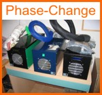 Ora che sappiamo come funziona un phase-change, vediamo come viene utilizzata la tecnologia phase-change per l’overclock. I primi phase-change sono arrivati in Italia circa 4 anni fa, i produttori erano 2: Prometeia e Asetek (che produce ancora oggi il VapoChill). Prodotti industriali, di ottima fattura e rifinitura, ma non molto potenti (Prometeia compressore da 1/3 di cv e Vapochill da ¼ di cv). Entrambi fatti nello stesso modo: stesso meccanismo dei frigoriferi precedentemente descritti, ma la potenza refrigerante veniva concentrata tutta su un evaporatore che veniva posto al di sopra della cpu, o eventualmente anche delle GPU, per raffreddarle. Questi phase-change, inoltre, hanno uno schermo di controllo della temperatura, tramite il quale può essere gestita, regolata e monitorizzata via software direttamente da Windows.
