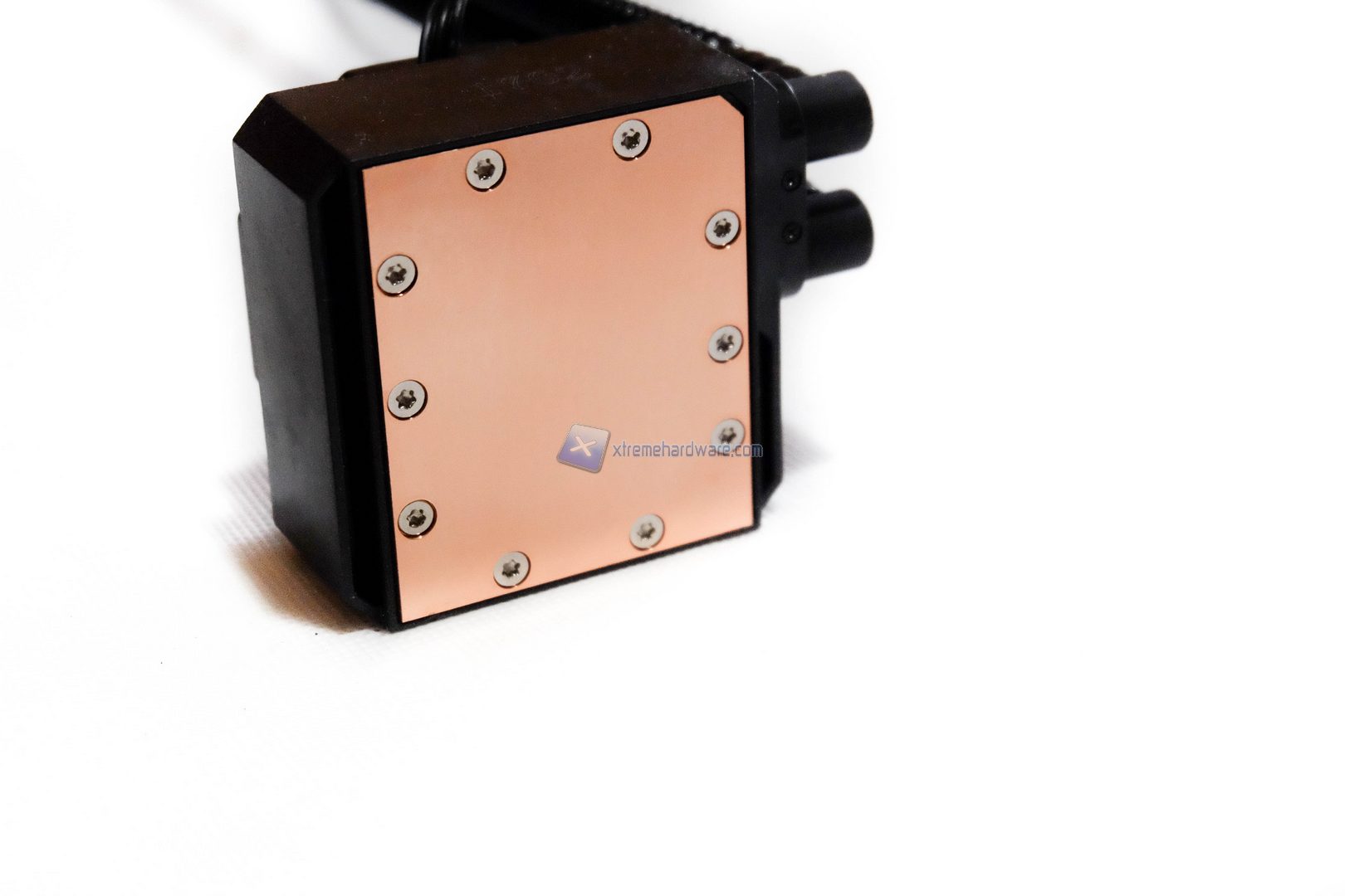 Capovolgendo il blocco mettiamo in mostra la base di contatto del dissipatore. Quest’ultima è realizzata completamente in rame, protetta da un piccolo sticker trasparente, e levigata a specchio. Lungo il perimetro sono presenti le classiche viti di sicurezza per evitare di aprire il dissipatore, invalidare la garanzia e creare problemi.