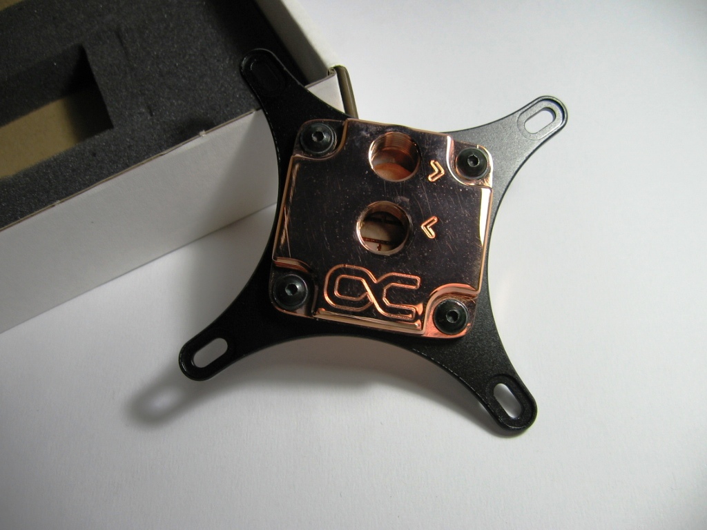 La parte centrale, ossia il corpo, è suddiviso il 2 parti tenute insieme alla staffa dalle 4 viti. Come si può vedere dalle foto precedenti sul blocco centrale in rame è stata applicata una laccatura che lo rende lucido, con effetto specchio. Altro particolare sono i simboli che indicano il foro di entrata da quello di uscita del liquido. Sul blocco è anche stampato il logo dell’azienda. Notiamo poi la staffa in nero, sempre di metallo costituita da un unico pezzo. Le due parti che costituiscono il corpo centrale sono la cover e la base. La staffa è bloccata tra di esse per mezzo delle 4 viti.
