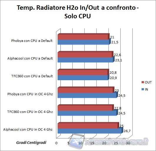Partiamo con la presentazione dei risultati comparativi raffreddando la sola CPU sia con freq. a default sia sotto overclock a 4014 MHz, mostrando le differenze rilevate sulla temperatura del liquido in entrata e all’uscita dal radiatore. Ci sembra irrilevante segnalare anche le differenze sul processore, ma possiamo dirvi che siamo in un range tra i 45° a riposo e gli 80° in full load.