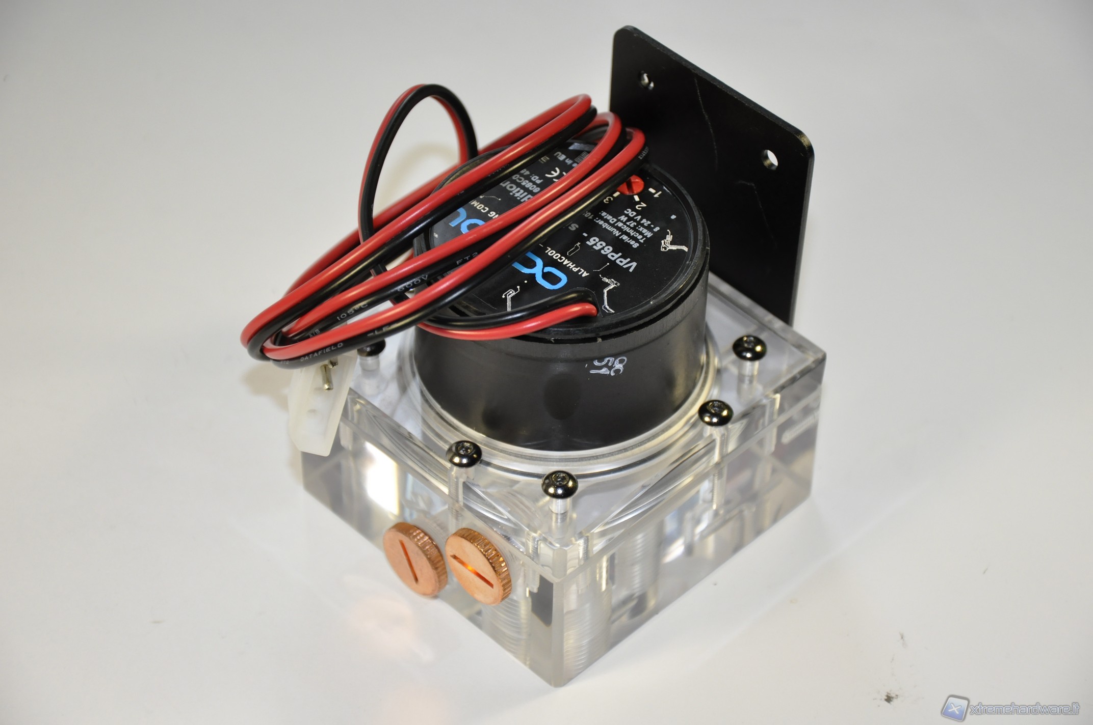 Essendo una pompa rotativa, il liquido uscirà per effetto della forza centrifuga. Come abbiamo visto, la pompa ha doppi fori, sia d’entrata che d’uscita, per cui può essere utilizzata per sdoppiare il circuito CPU-VGA. L’importante è collegare il circuito al foro d’entrata della pompa, a valle della vaschetta, per far in modo che sia sempre alimentata da liquido, viceversa si rovinerebbe in breve tempo dato l’elevato regime di rotazione. La pompa è alimentata a 12 volt tramite il cavo molex fornito in dotazione.