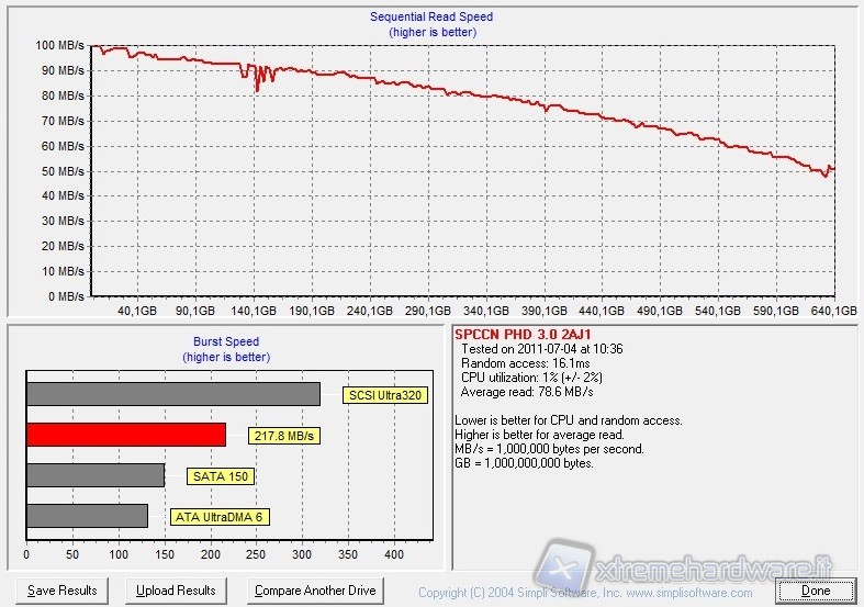 The results obtained are consistent with those of the other benchmarks, in fact resulting in an average of 78.6 MB/s and an Access Time of 16.1ms they are scarcely different from the results of HDTune PRO.