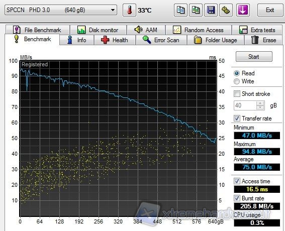 The values obtained for the benchmarks in both reading and writing demonstrate good internal disk drive performance, stood at 75 MB/s. Very good write access time which is very low and equal to 6.67ms. If we take this data and compare it with 3.5" hard drives data it will result very performing and not very common in 2.5" disks.