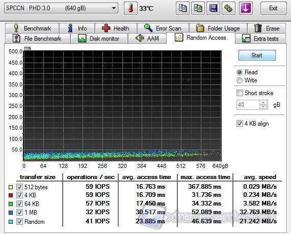 The last test we performed uses the AIDA software. We selected the RANDOM READ test. The results do not differ from other tests performed previously, AIDA gives us further confirmation of the good overall performance of the disc that totals an average reading of 75.7 MB/s.