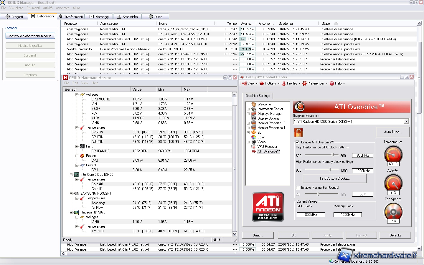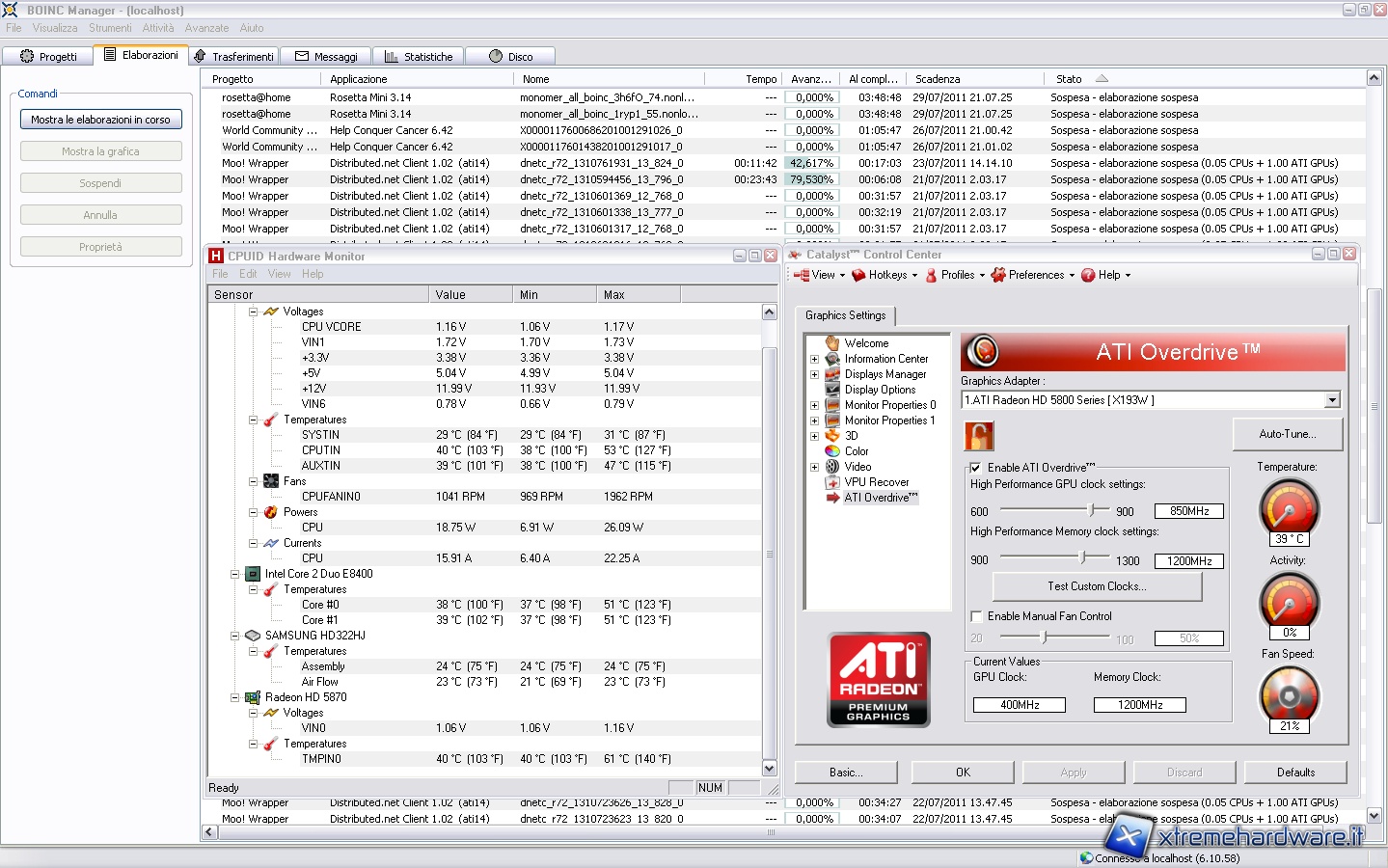 After this test, we assemble the Accelero XTREME Plus II, using the pins relative to 7V, and we launch the same programs again. We notice immediately that the temperature has dropped dramatically bringing to 40° at idle and once started BOINC, 60° in full load, with 13 degrees of difference at idle and 18 at full load.