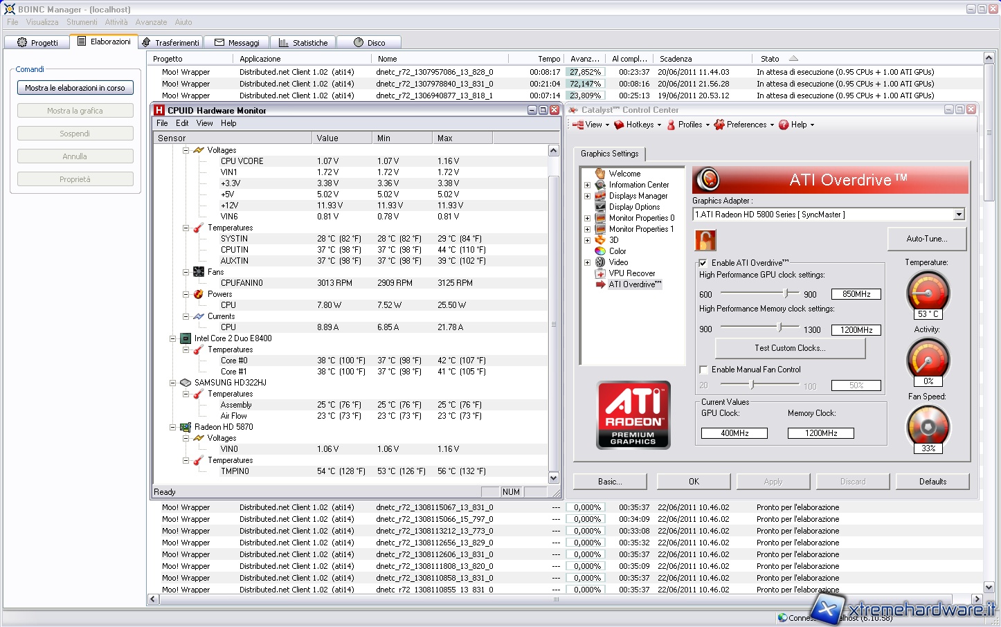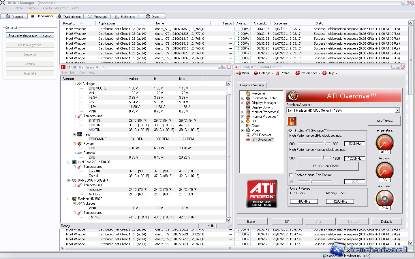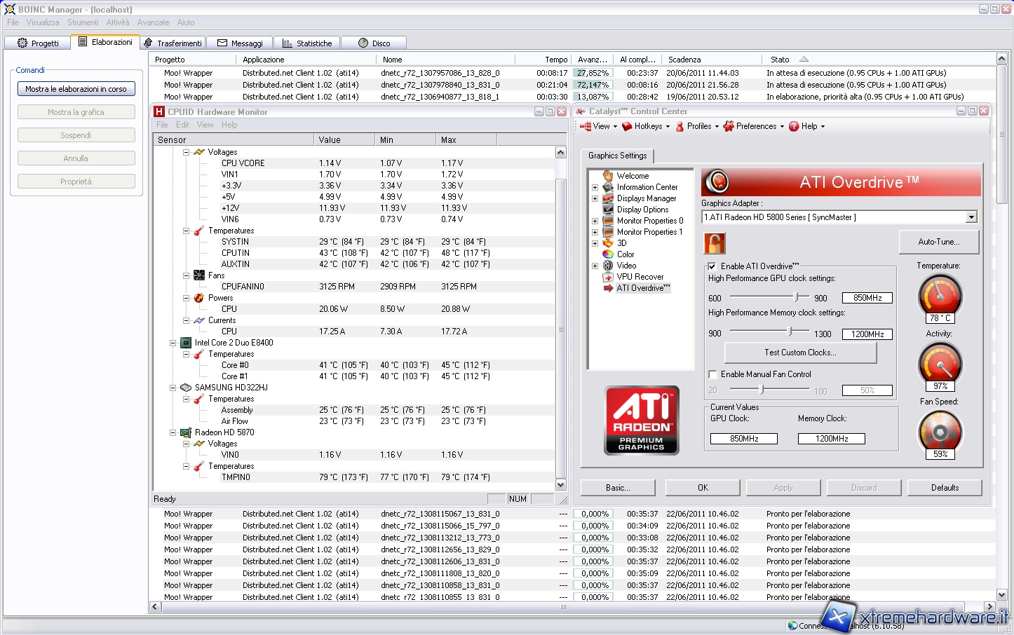 The software used for our test are HWMonitor of CPUID family that can detect the temperature of processor, video card, hard drives and other peripherals and the ATI Overdrive panel in the Catalyst Control Center that allows us to monitor temperature, load percentage of video card and operating frequencies.