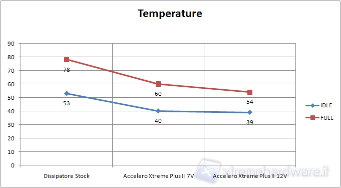 Below is a comparison chart of all the measured temperatures, with both stock heat sink and with the Accelero XTREME II Plus at 7 and 12 volts.