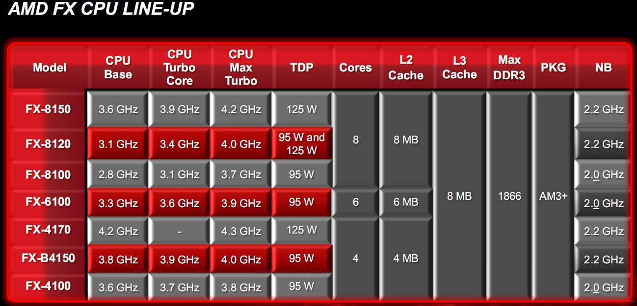 In figure one can see the overview of the various Bulldozer CPUs available from October 12, 2011. As you can see there are 4 models in the 8xxx FX series at 125W and 95W of 8-core (the FX 8150, FX 8120 and FX 8100), a 6-core model of 6xxx FX series (FX 6100) and three 4-core models 4xxx FX series (models FX 4170, FX B4150 and FX 4100), with the frequency record for the desktop CPU as the CPU FX 4170 has 4.2GHz, which will be introduced later.