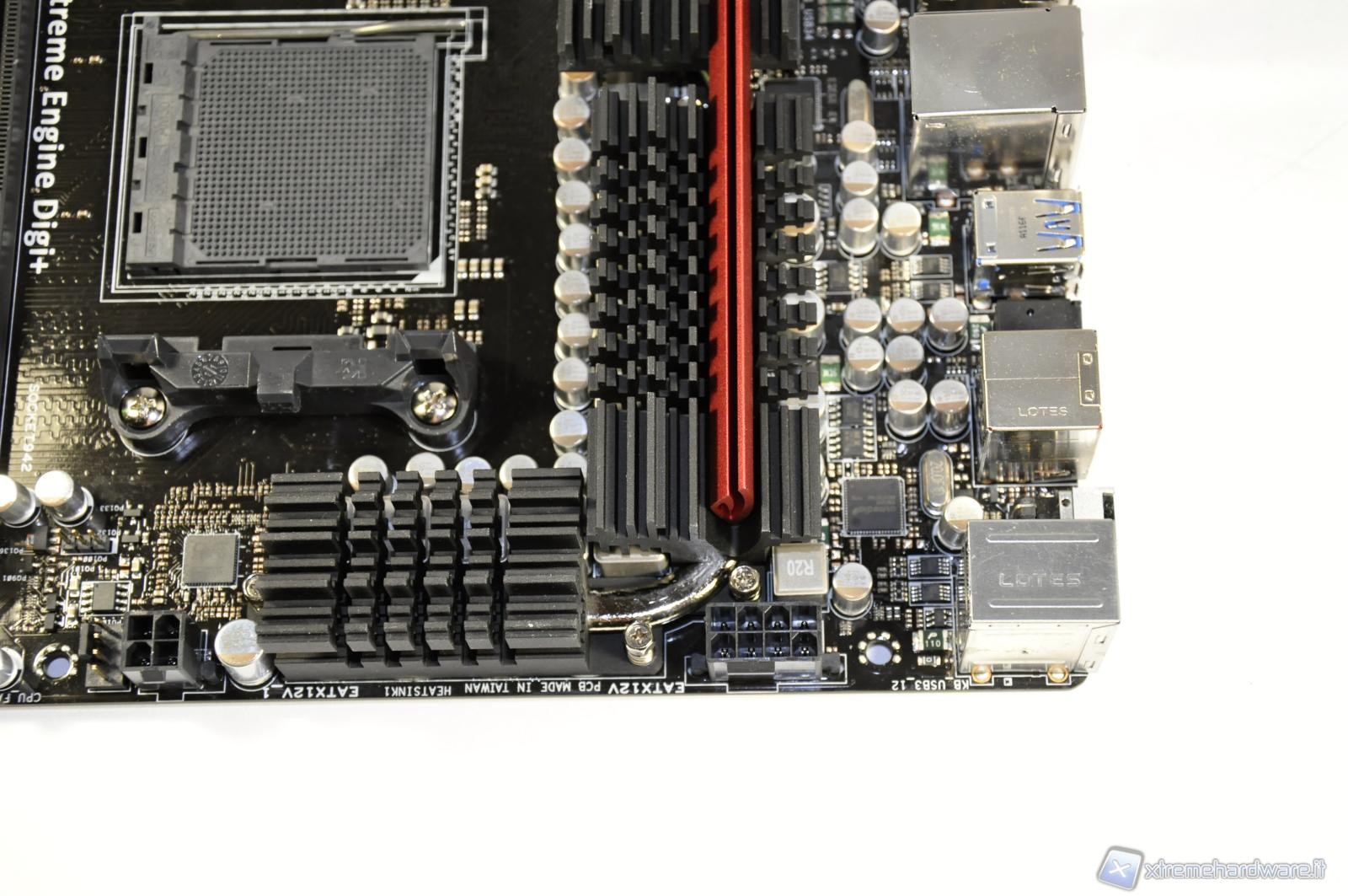 Highlighted, covered by the adhesive, the ASUS Crosshair Formula V has a dedicated audio chip from Creative, the X-Fi 2 SupremeFX signal processing for high-definition audio.