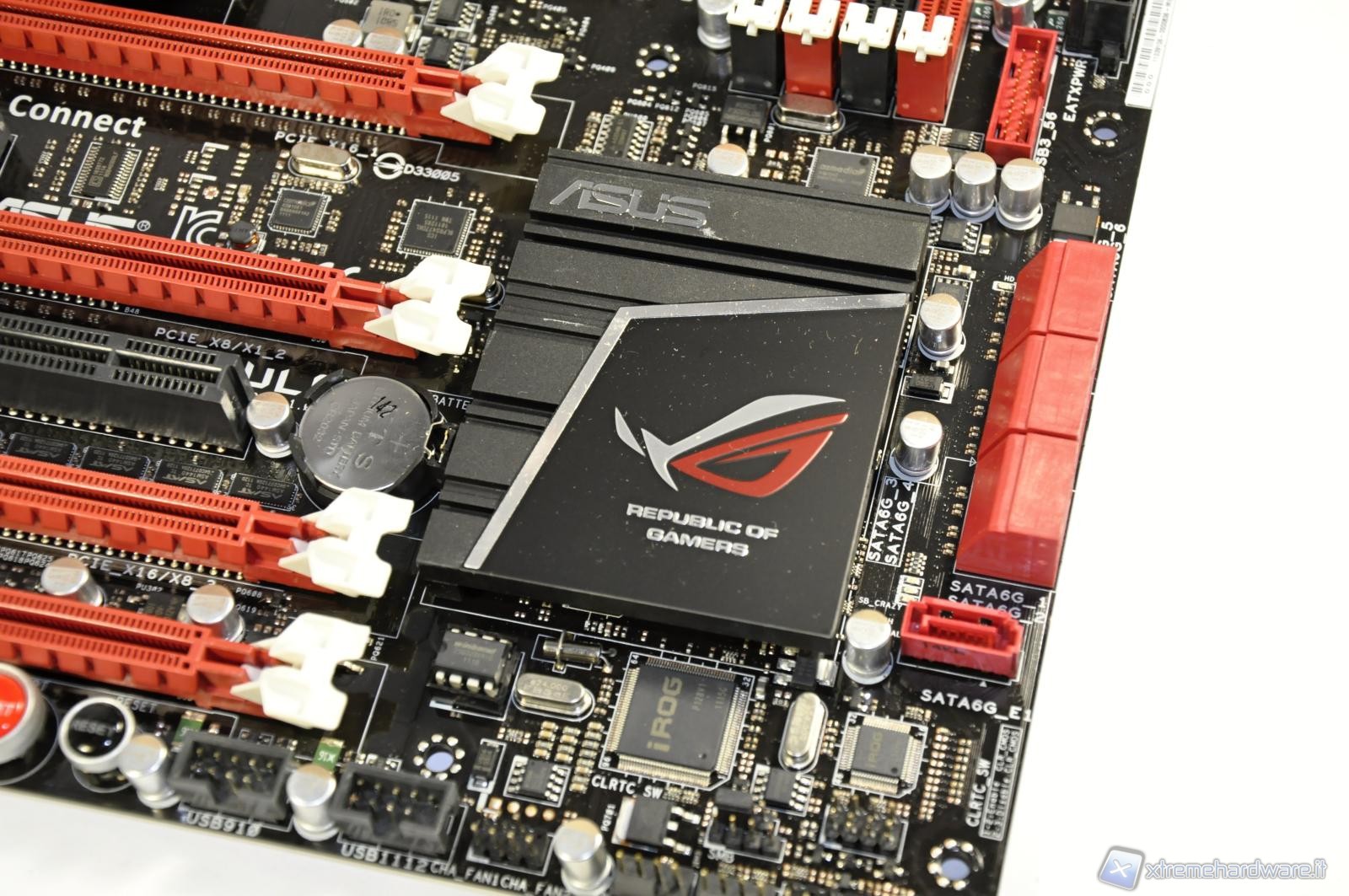 In the picture an elegant passive heat sink above the SB950 southbridge. Below, the support chip for iROG technology for system overclocking.