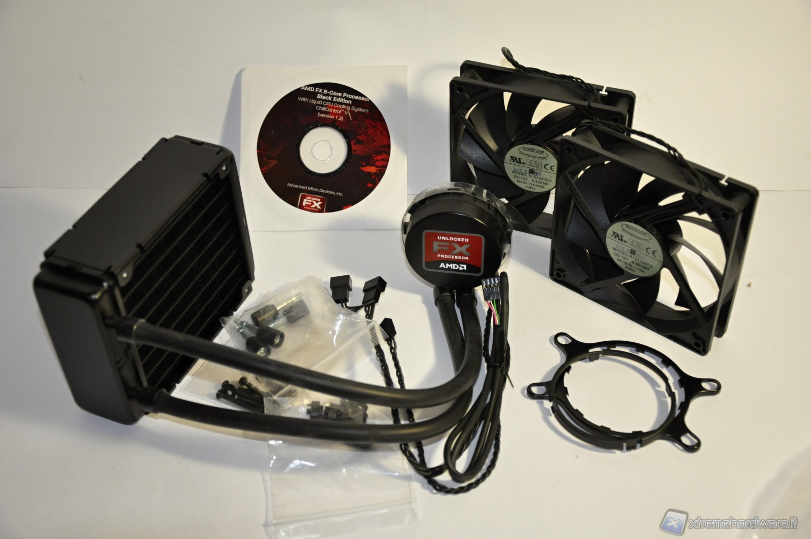 The version of the processor received in our labs was accompanied by the Liquid CPU Cooling System, just a kit supplied by AMD as an optional liquid cooling system in the sale of Bulldozer. This kit, of which we propose some photos, consists essentially of two objects: 120mm radiator and waterblock.